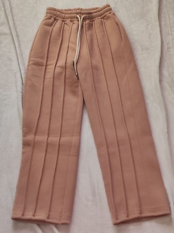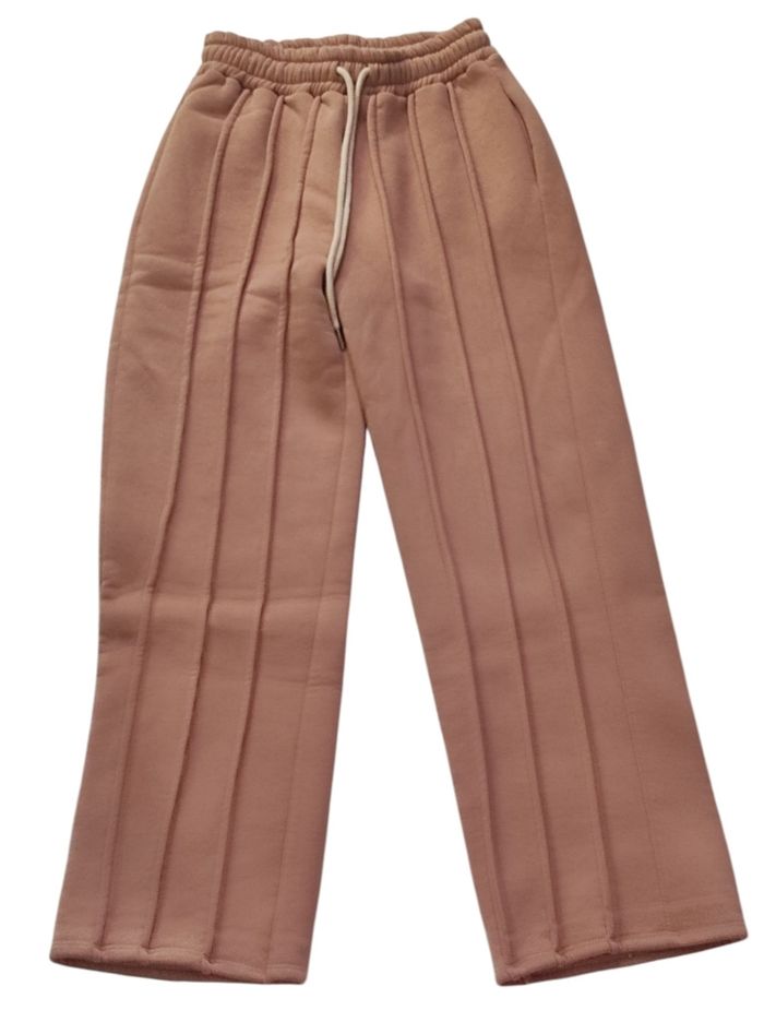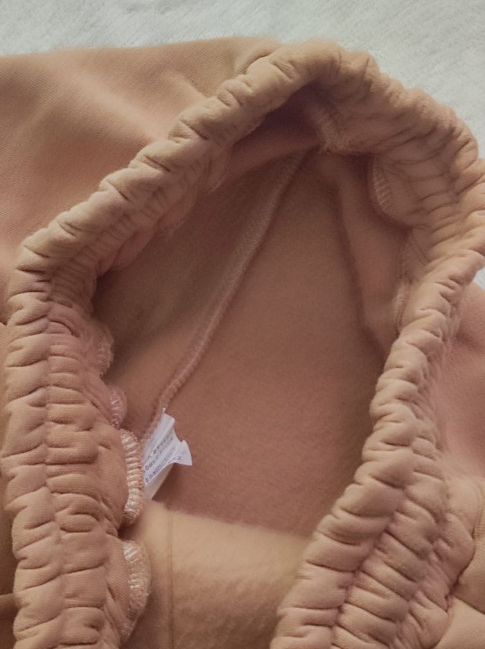 pantalon jogging de couleur taupe / camel avec relief, à coupe large et poches latérales. Taille élastique avec cordon, intérieur fourré. 95% coton et 5% elasthanne. Jamais portée ( oublier au fond du placard ). Taille unique Tour de taille 35 cm Tour de hanches 53 cm Longueur 104 cm. En parfait état, ni trous tâches ou déchirures.