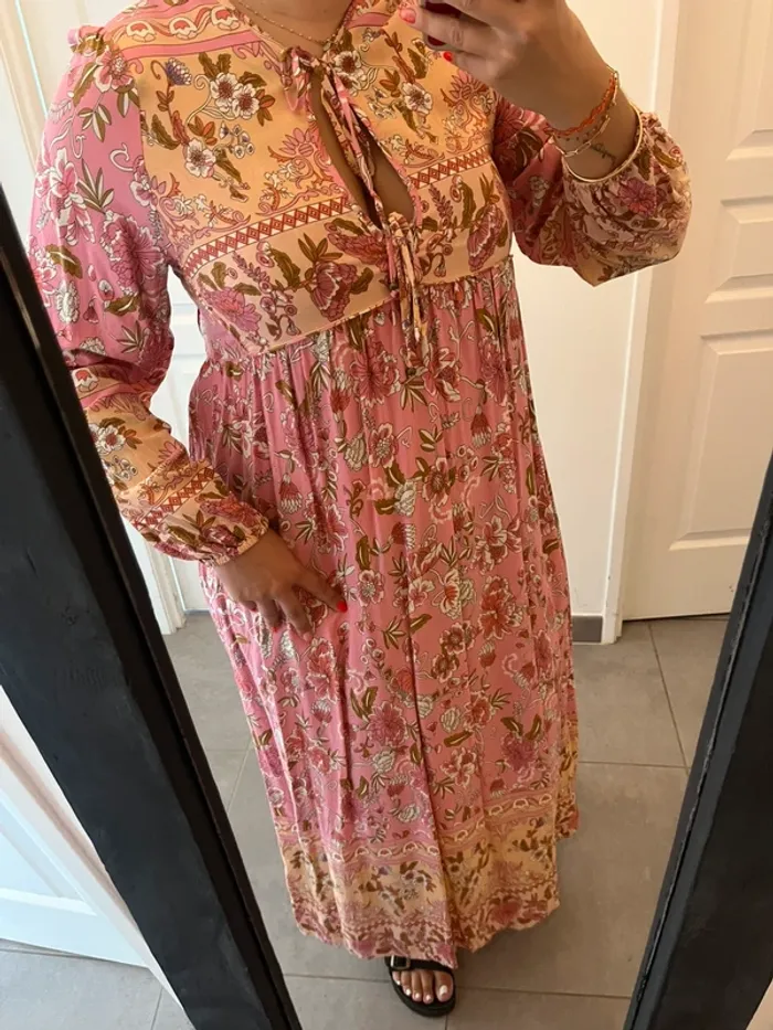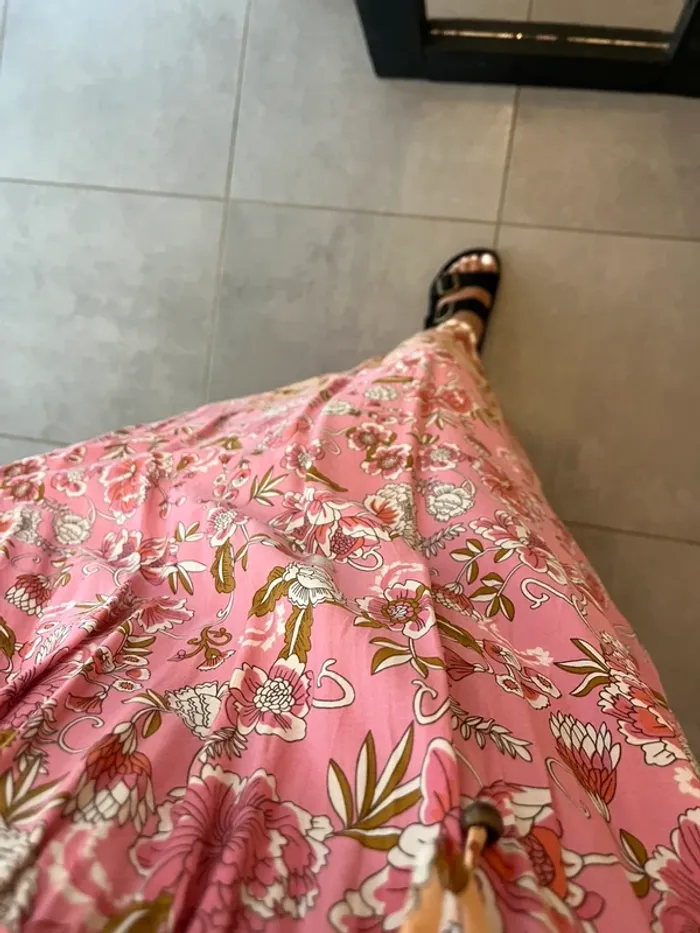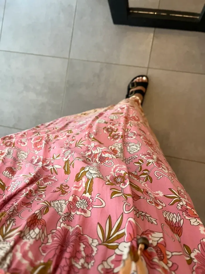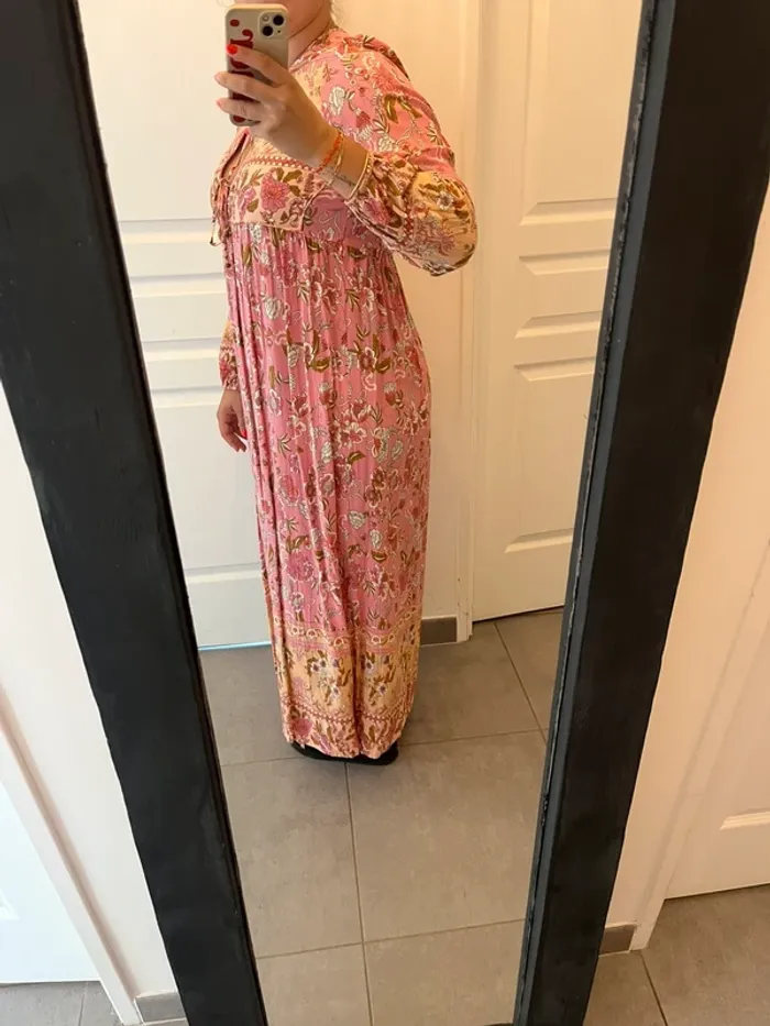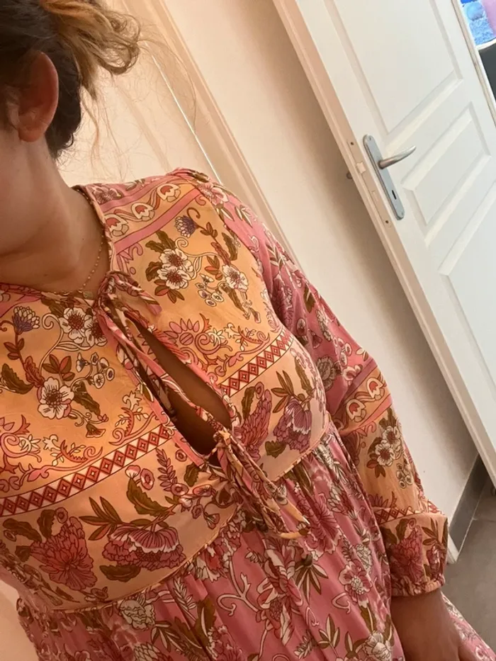 Robe longue très jolie avec des noeuds ah niveaux de la poitrine pour fermer comme vous le souhaitez la robe Assez fluide rose avec des fleurs pratiquement neuve porté 1 fois taille M