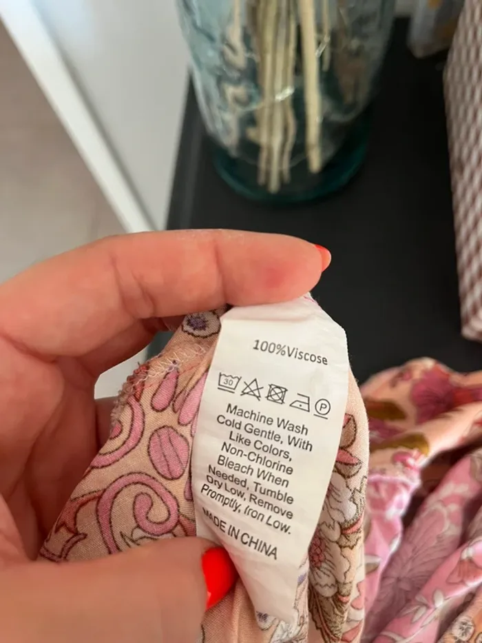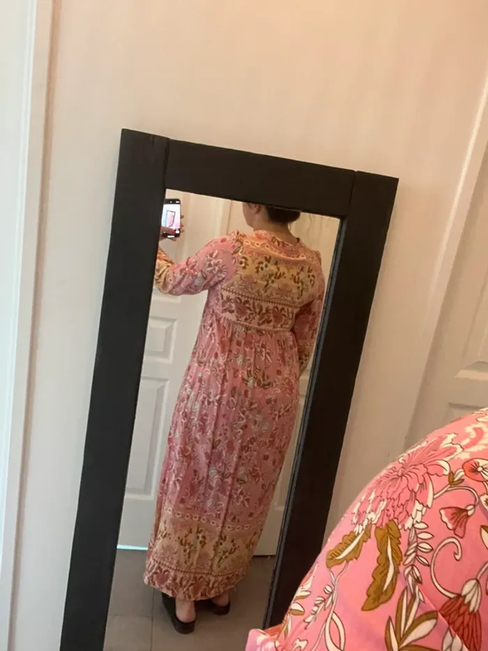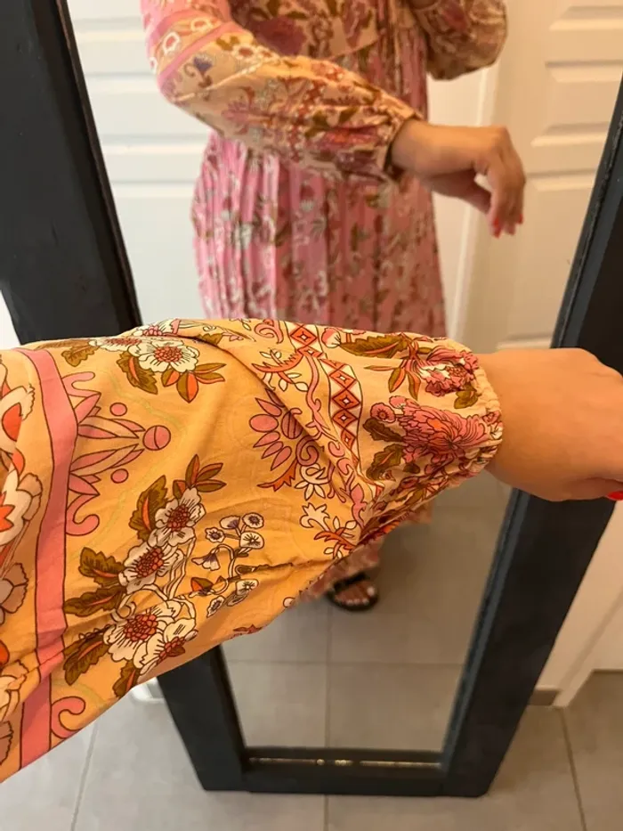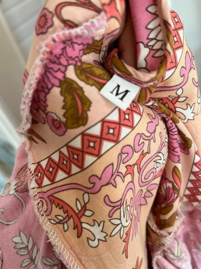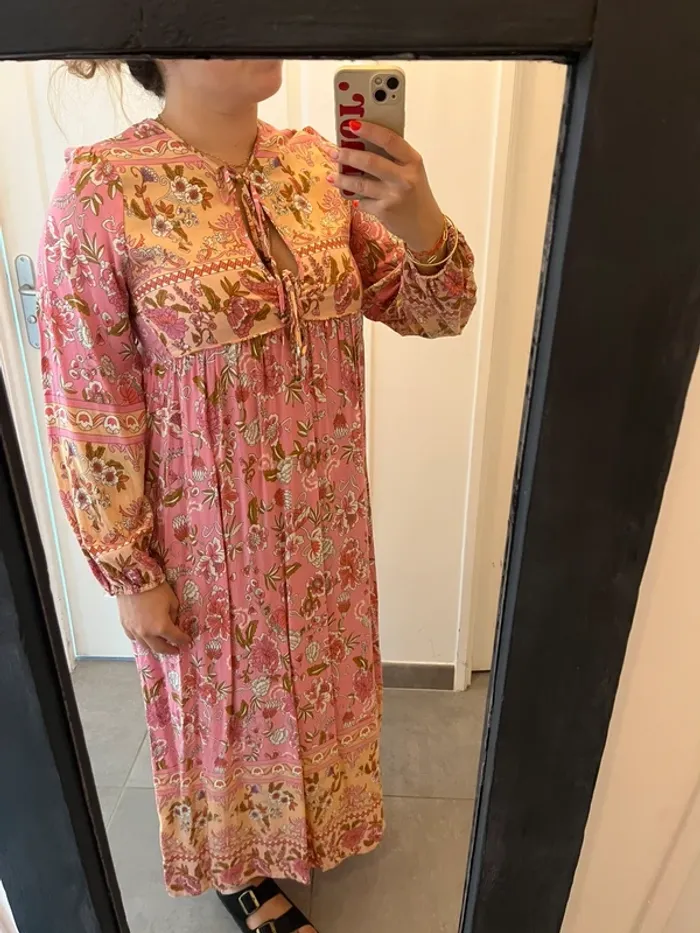 Robe longue très jolie avec des noeuds ah niveaux de la poitrine pour fermer comme vous le souhaitez la robe Assez fluide rose avec des fleurs pratiquement neuve porté 1 fois taille M