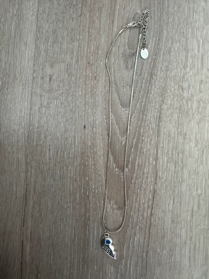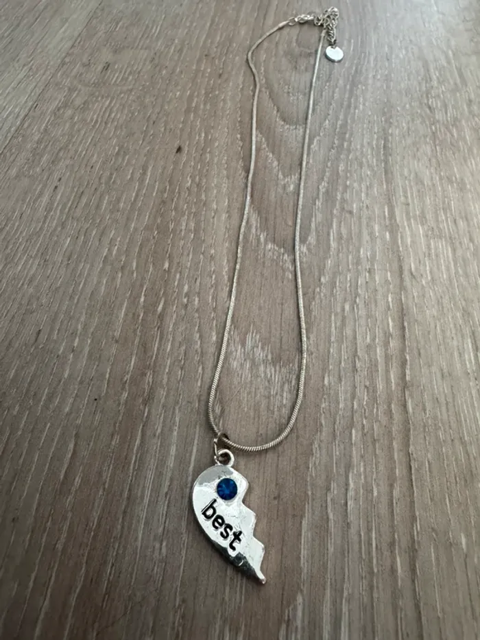Collier avec pendentif moitié de cœur avec écrit « best » et petite strass bleue. Bon état mais à quelques rayures et la chaîne est un peu abîmés (jauni/verdi). Identique aux photos ✅ Possibilité de l’intégrer à un lot à moindre coût. D’autres vêtements homme, femme, enfants, chaussures, dvd, livres, playmobil, affaires d’équitation… dans mon dressing, n’hésitez pas à aller faire un tour. 🛍️ Possibilité de faire des lots à petit prix sur demande, j’étudie toute proposition (sauf échange). 🤏🏼 N’hésitez pas à me contacter si vous avez des questions, les colis sont envoyés rapidement. 😉 Toutes mes mises en colis sont filmées donc aucune arnaque possible ! ❌