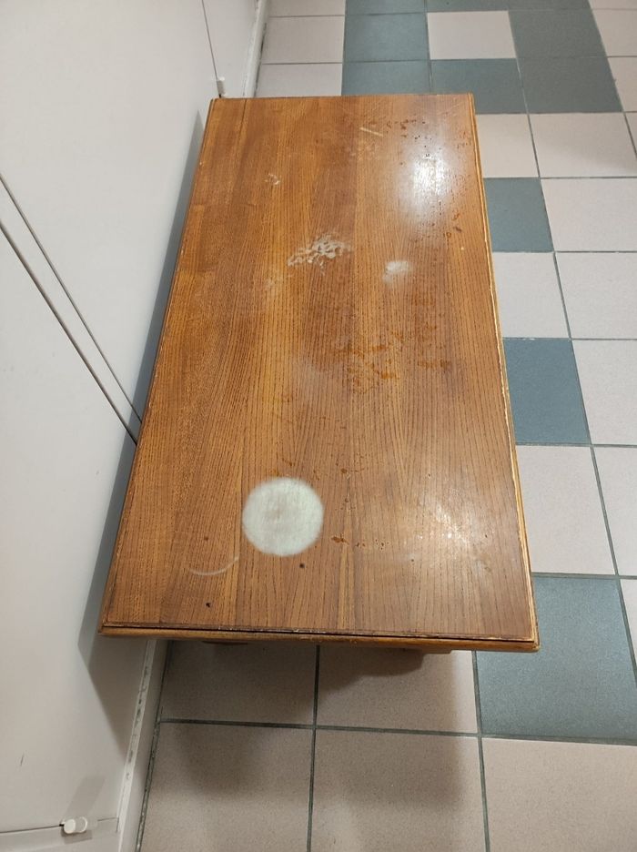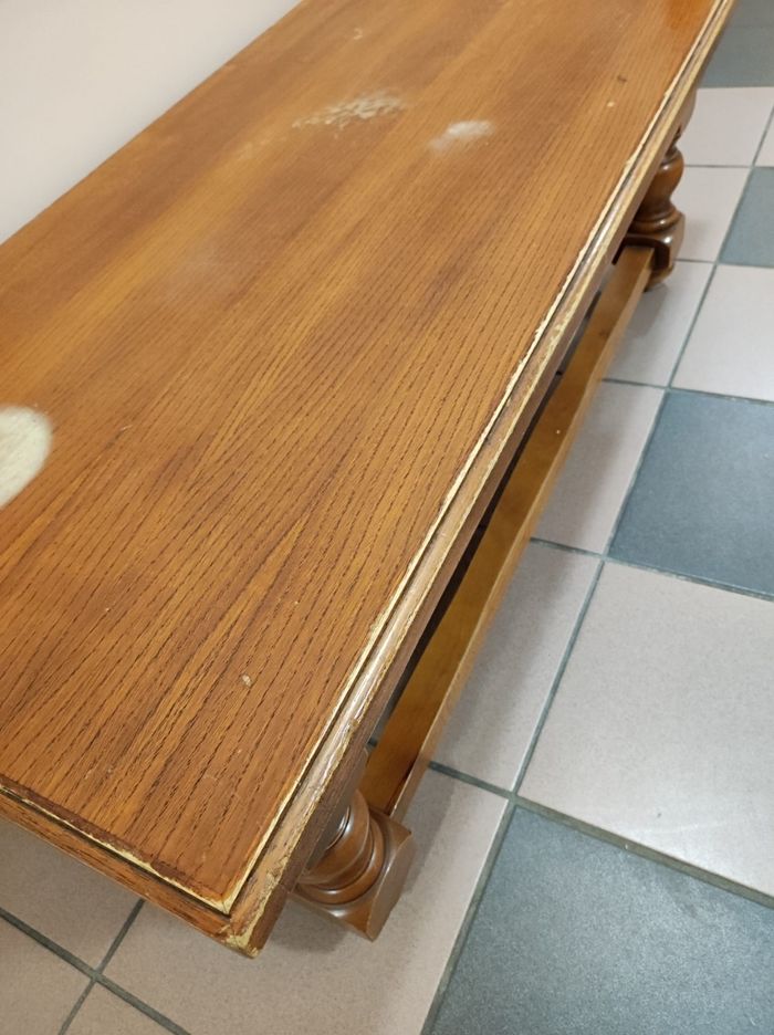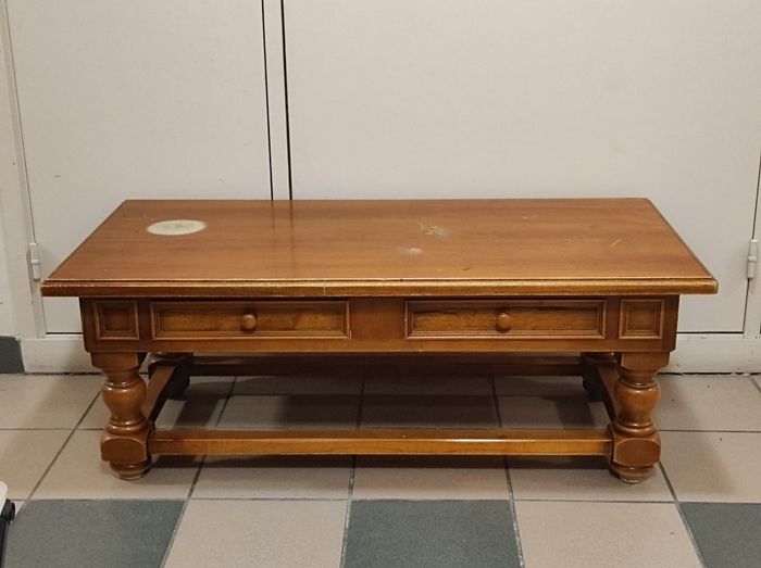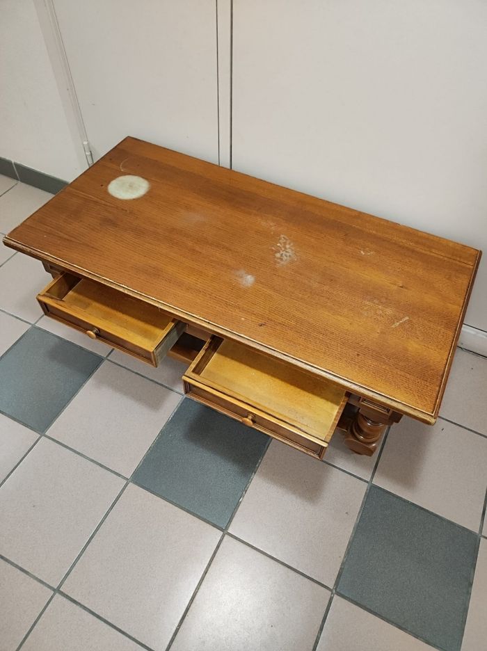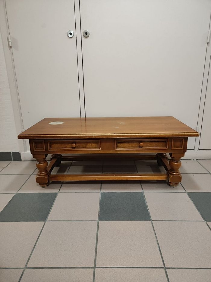 Grande table basse en bois massif avec deux tiroirs. La structure dont les pieds sont en très bon état, seul le plateau et les bordures ont des traces d'usures et de décoloration dû aux assiettes. Elle est lourde mais transportable à deux personnes. Dimensions Hauteur 45cm Longueur 119cm Profondeur 59,5cm Prix négociable car doit partir le plus rapidement possible. Secteur Vénissieux région lyonnaise