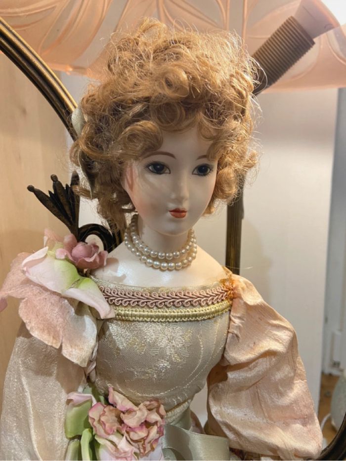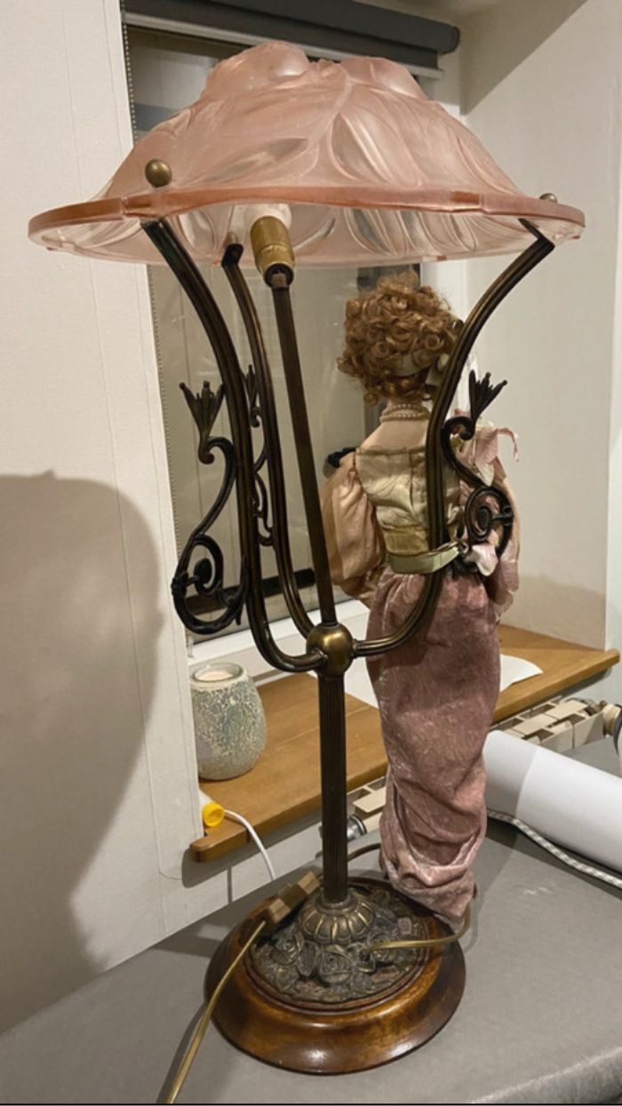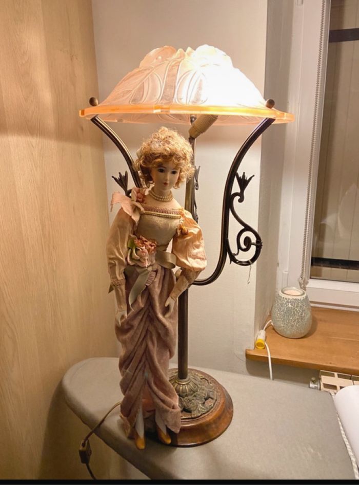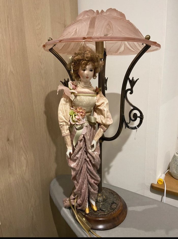 A vendre. À vendre. Très jolie lampe décorative électrique art déco en bois et bronze avec une poupée en porcelaine. Hauteur: 70 cm, Largeur globale: 36,5 cm, poids: 5 kg4. Possibilité d’enlever la poupée pour garder uniquement la lampe.