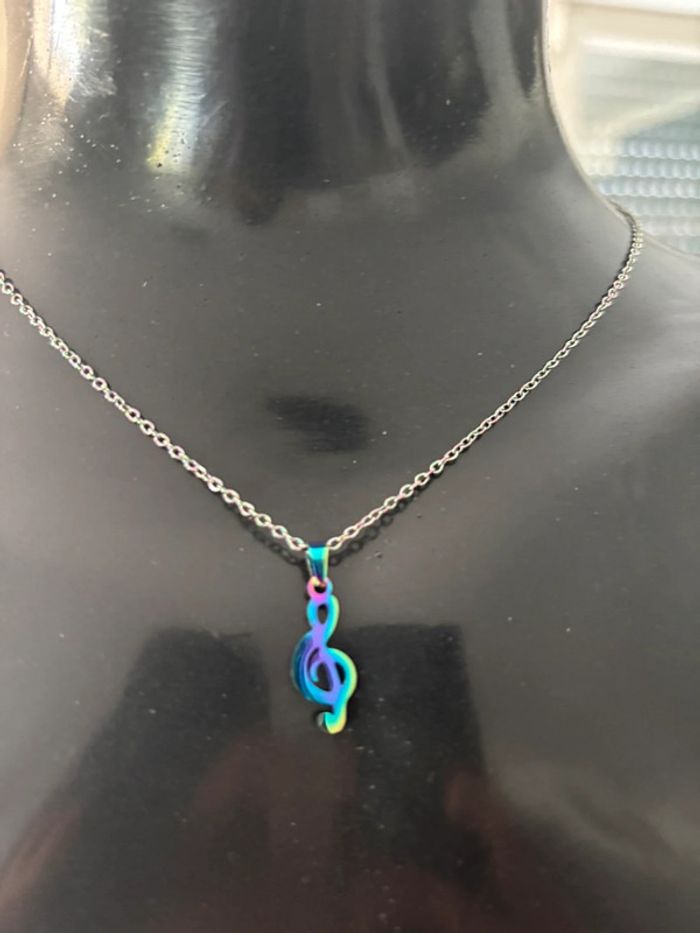 Adorable ensemble bijoux pour les passionné(e)s de musique 💜 Comprend un collier à pendentif clé de sol irisée + une paire de boucles d’oreilles assorties. Finition multicolore (effet arc-en-ciel / métallique). Léger, original et parfait pour offrir ou se faire plaisir ! 🎁 🔹 État : Neuf, jamais porté (voir photo avec la carte) 🔹 Matière : Acier inoxydable fantaisie (effet chromé) 🔹 Fermoir : classique 🔹 Style : discret, tendance, musical 🎼