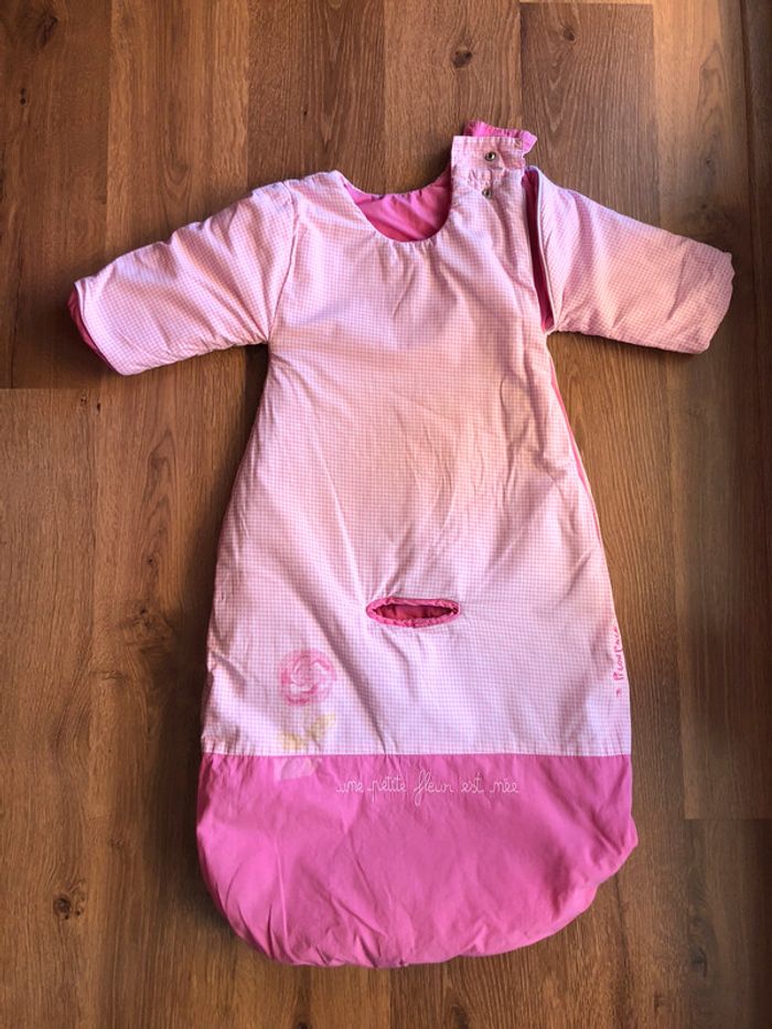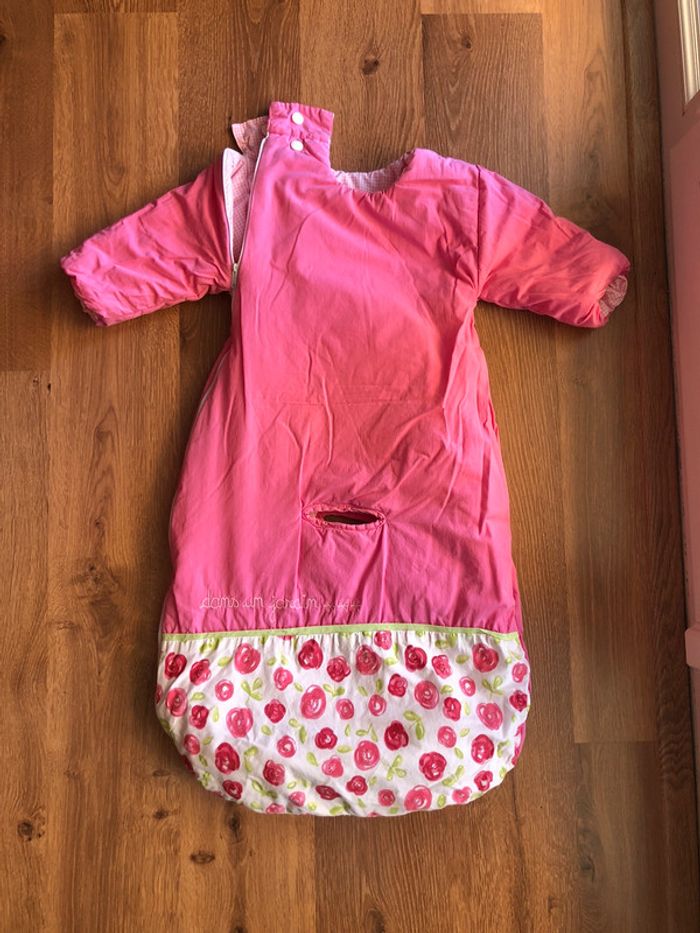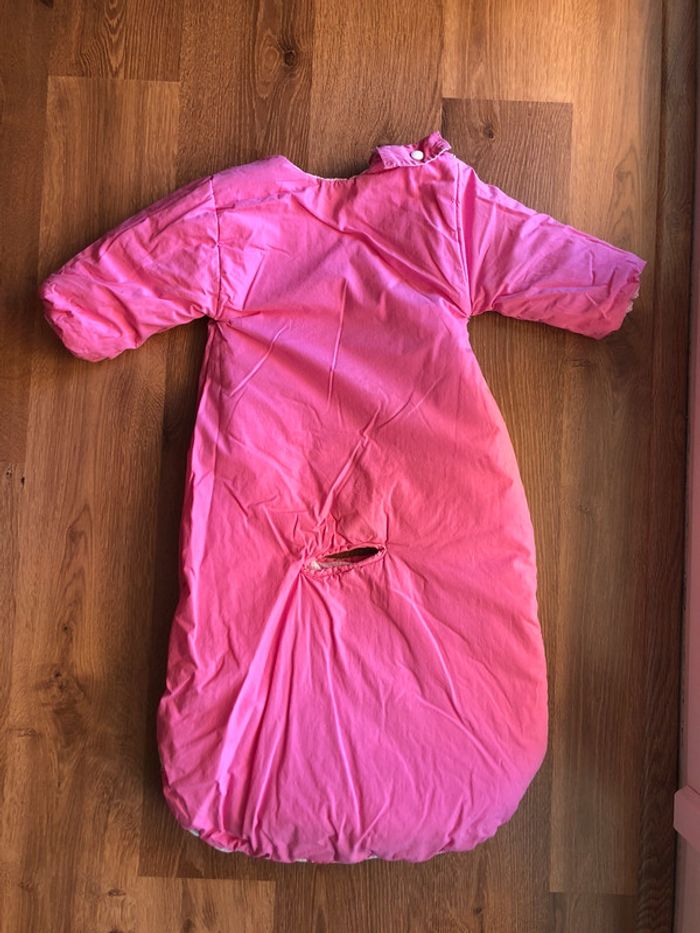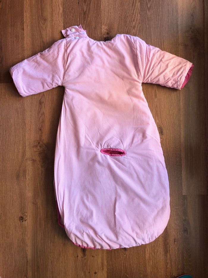 Bon état, longueur 80 cm, réversible avec manches (non amovibles), idéale pour les trajets en voiture car découpée au niveau de l’entre-cuisse pour le harnais Un côté rose framboise et l’autre côté rose vichy