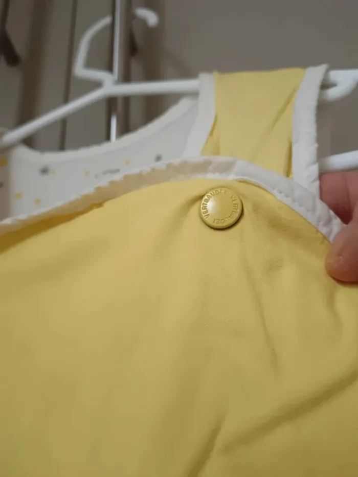 Gigoteuse doublée en coton Vertbaudet taille 90cm. Jaune imprimée et brodée motofs lapins. Fermeture par glissière latérale et pressions aux épaules. En très bon état.