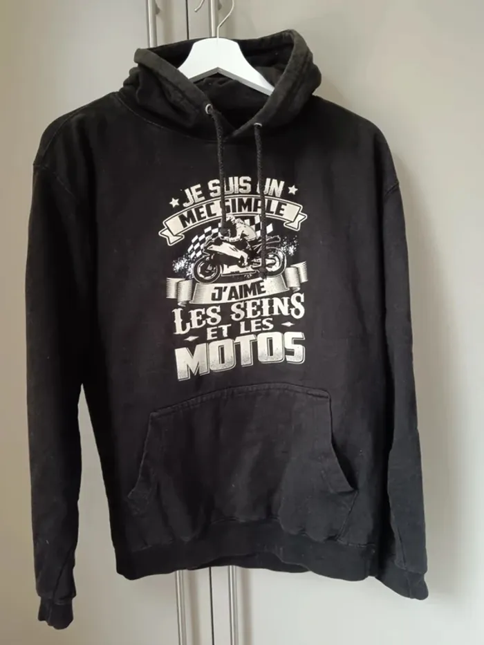 Sweat à capuche pour motard avec message floqué à l'avant. Étiquette de taille coupée, c'est un M En très bon état.