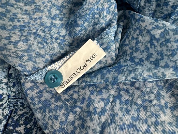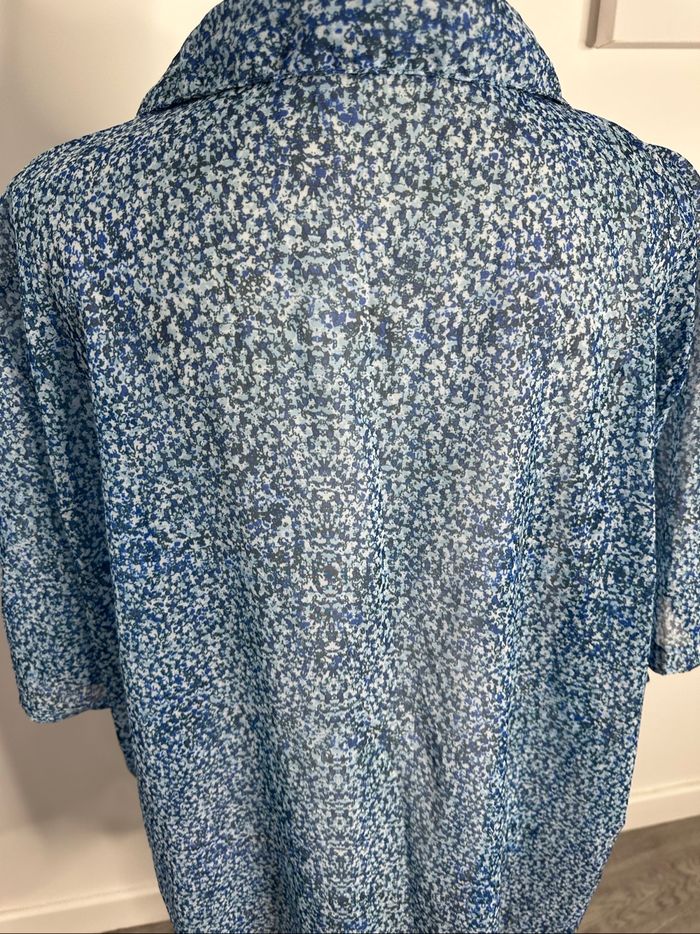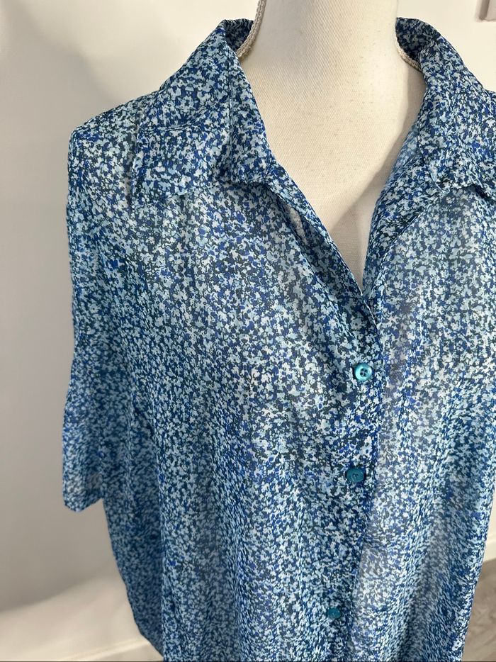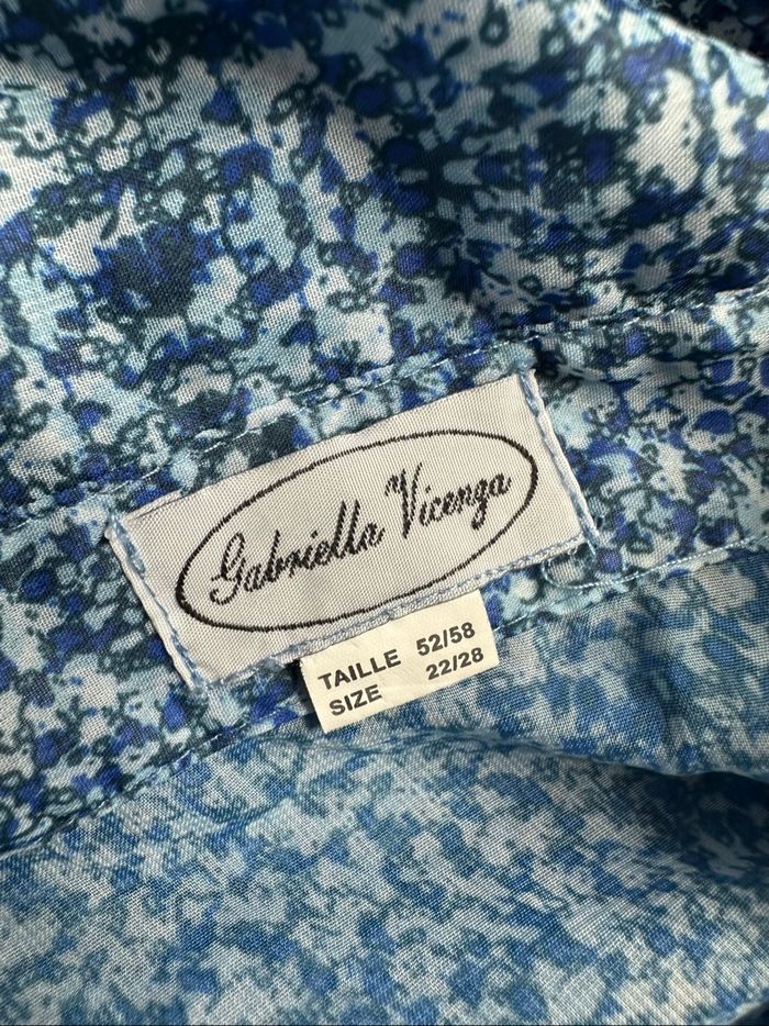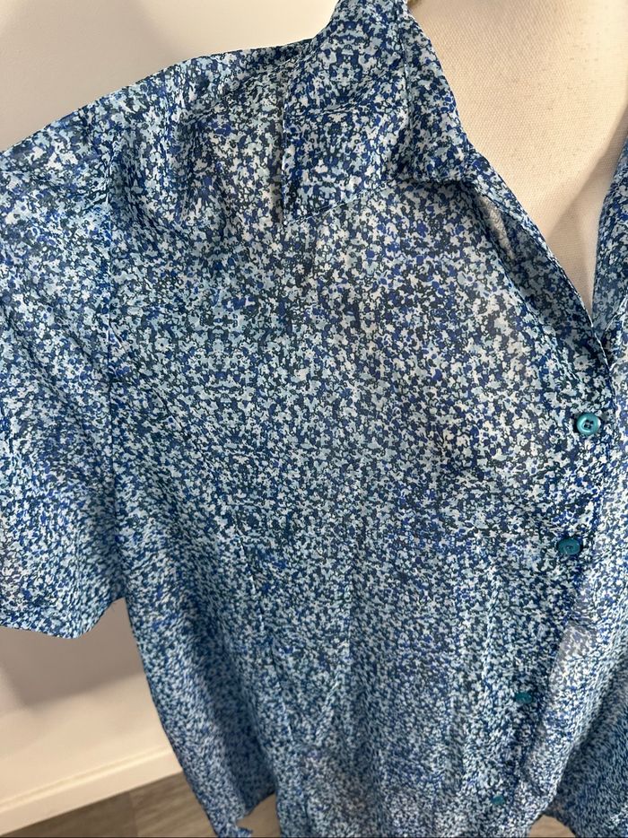 Chemisier - Excellent état - Taille 52 équivalent 6XL Dimensions en bas de l’annonce - Imprimés fleurs - Vintage, années 80’ - Dans les tons bleus - Tissus légèrement transparent - Manches courtes - Se ferme avec des boutons - 100% polyester Dimensions: - 72cm niveau aisselles - 77cm de long