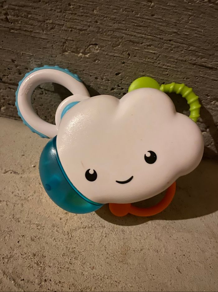 Un hochet conçu pour faciliter le développement de l'ouïe au cours des premiers mois de l'enfant. Le petit nuage tourne et recrée le son de la pluie avec le mouvement des billes. Les poignées permettent de saisir facilement le nuage pour le faire tourner et présentent différentes textures pour stimuler la perception tactile. Un hochet conçu pour faciliter le développement de l'ouïe au cours des premiers mois de l'enfant. Des 3 mois En bon état
