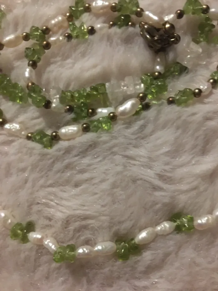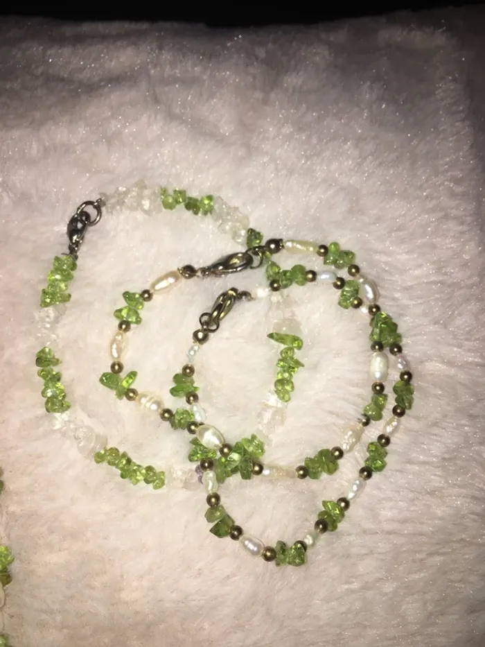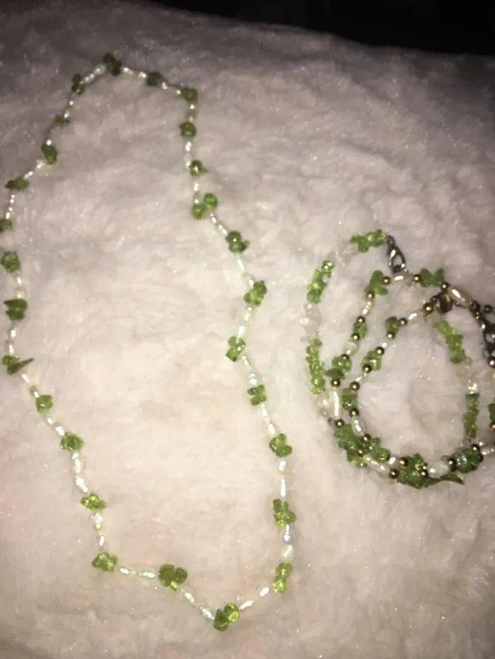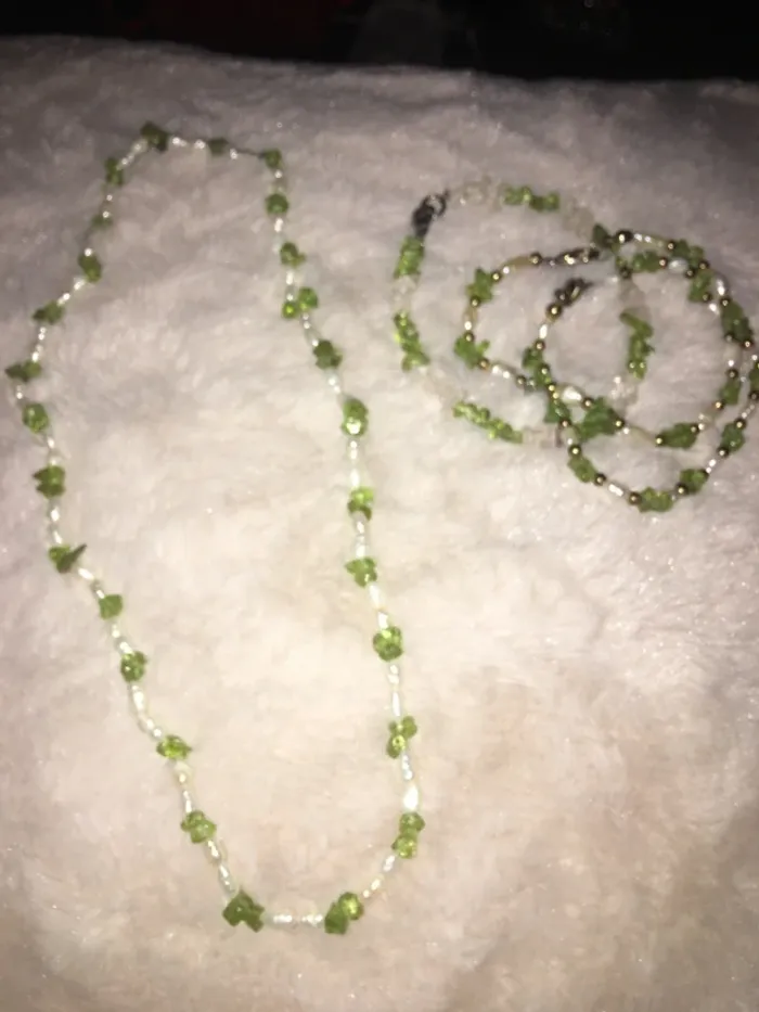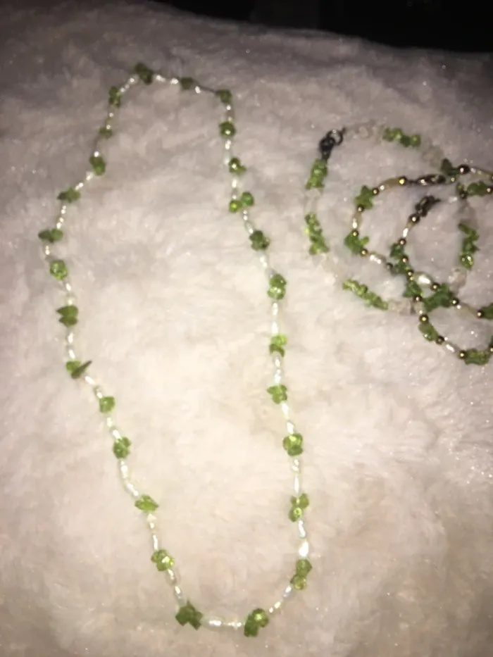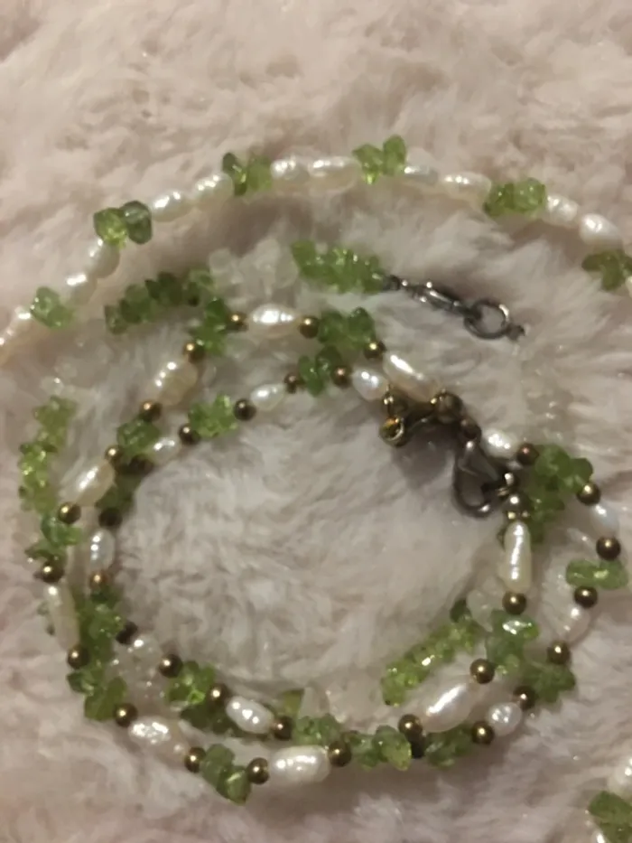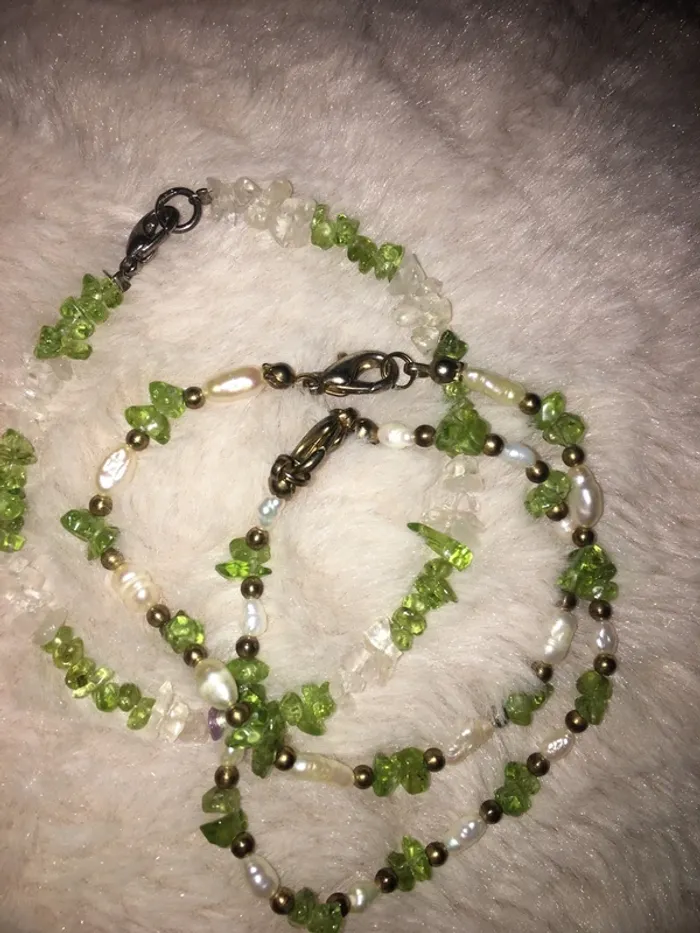 Collier et 3 bracelets de baroques vertes et d’eau douce ,pierre de naissance d’août. #perles #collierperles #braceletperlesetpierres #braceletetcollier