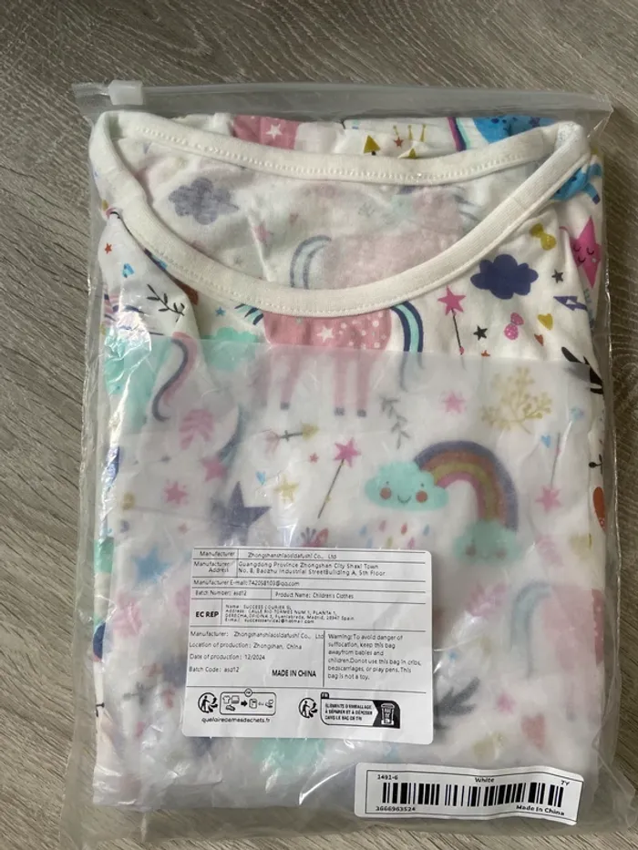 Neuve jamais portee erreur de taille Robe en coton blanche motif licornes arc en ciel étoile nuage fleurs multicolores Taille 7 ans manche courte