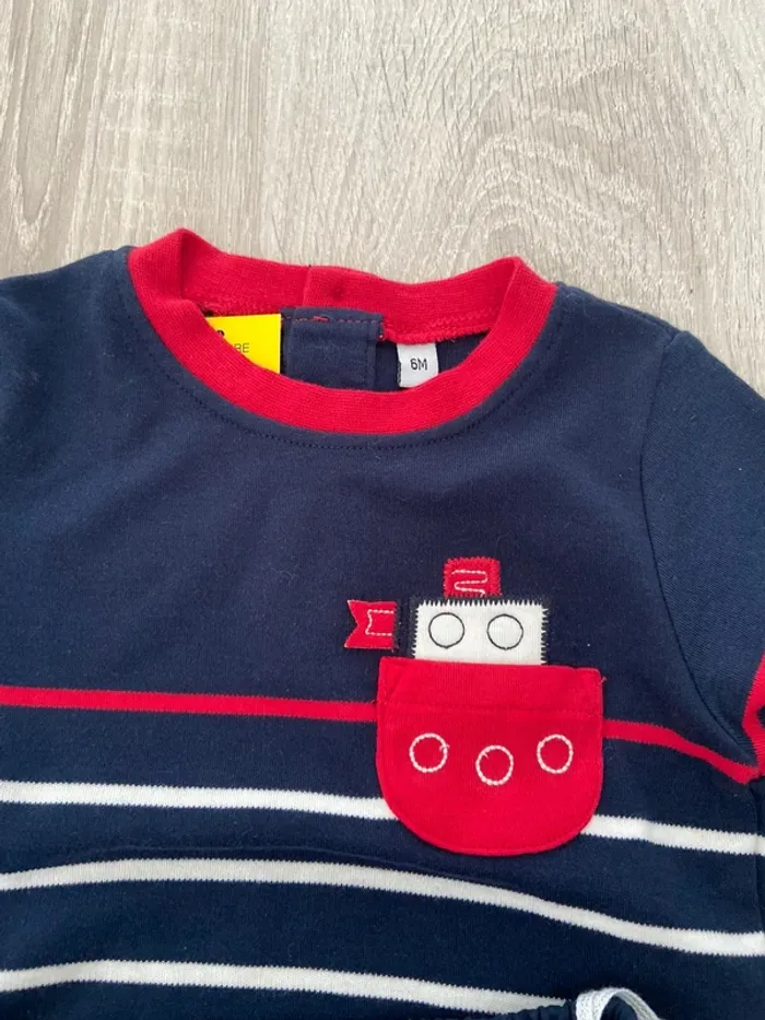 Neuf jamais porté avec étiquette 6 mois bébé garcon taille grand 1 pantalon 1 t shirt manche longue marinière bleu blanc rouge motif bateau 1 paire chaussettes assortie taille 17/ 18