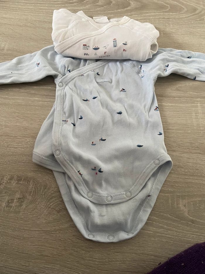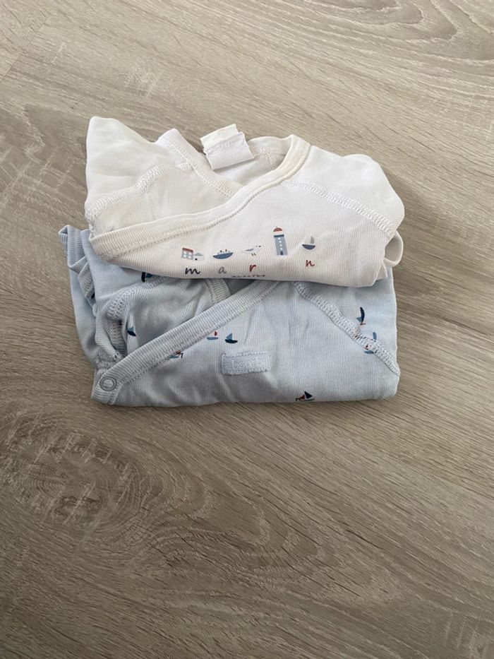 1 mois 53 cm Absorba Body bebe naissance garçon 1 bleu et 1 blanc thème marin bateau Manche longue fermeture devant