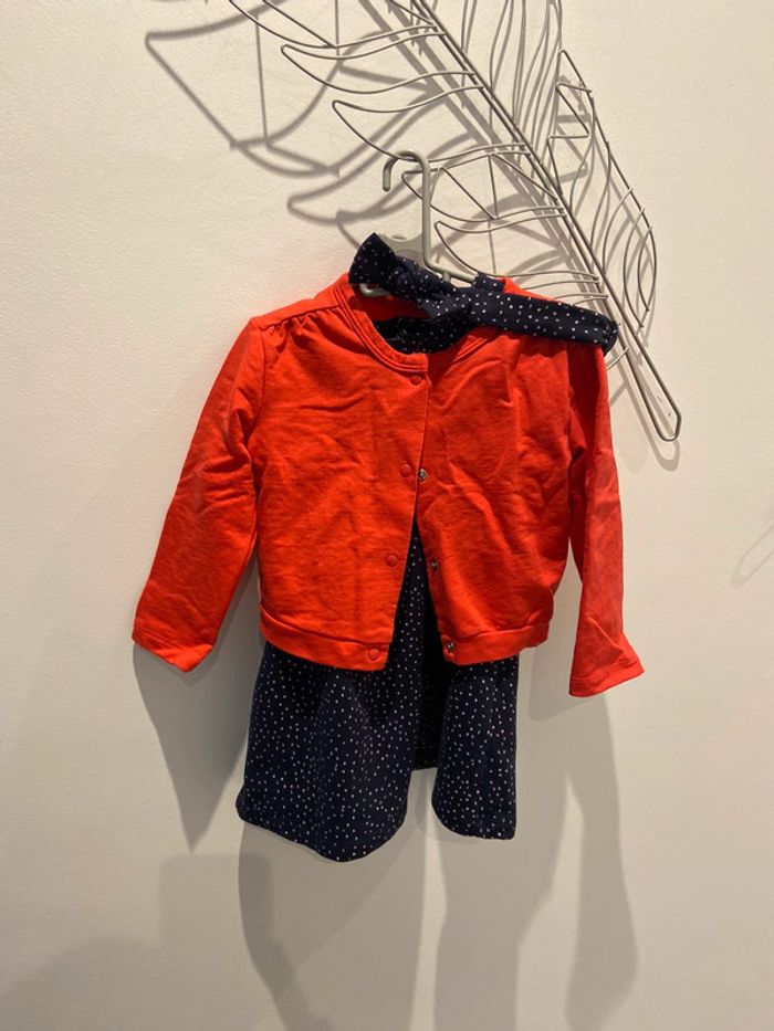 Neuf jamais porté ni lavée juste etiquette coupée Ensemble gemo 3 ans taille grand conviendra à 4 ans également 1 robe bleue marine motif rouge et blanc manche longue 1 gilet rouge assortie pour l hiver 1 bandeau cheveux assorti Parfait pour fêté de fin d’année noel fille