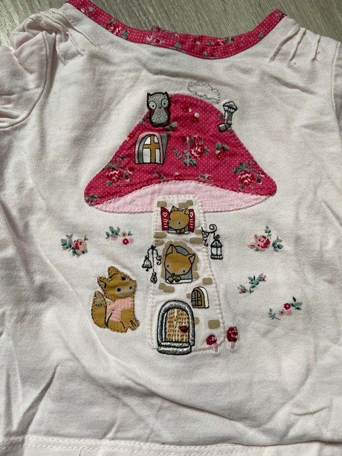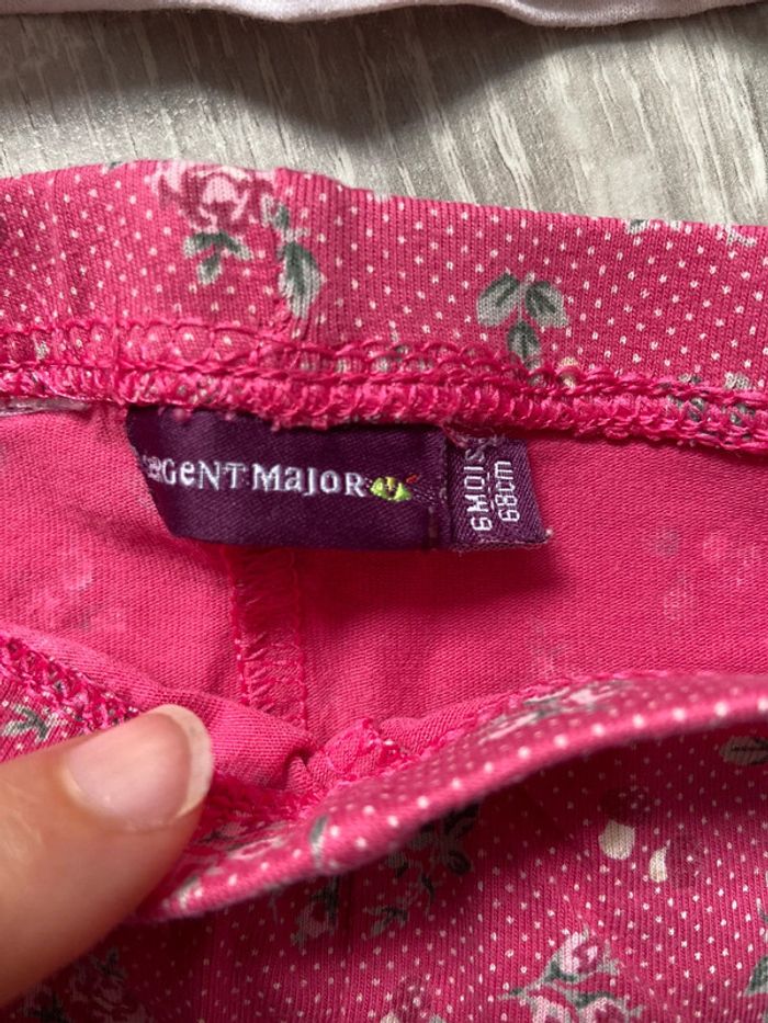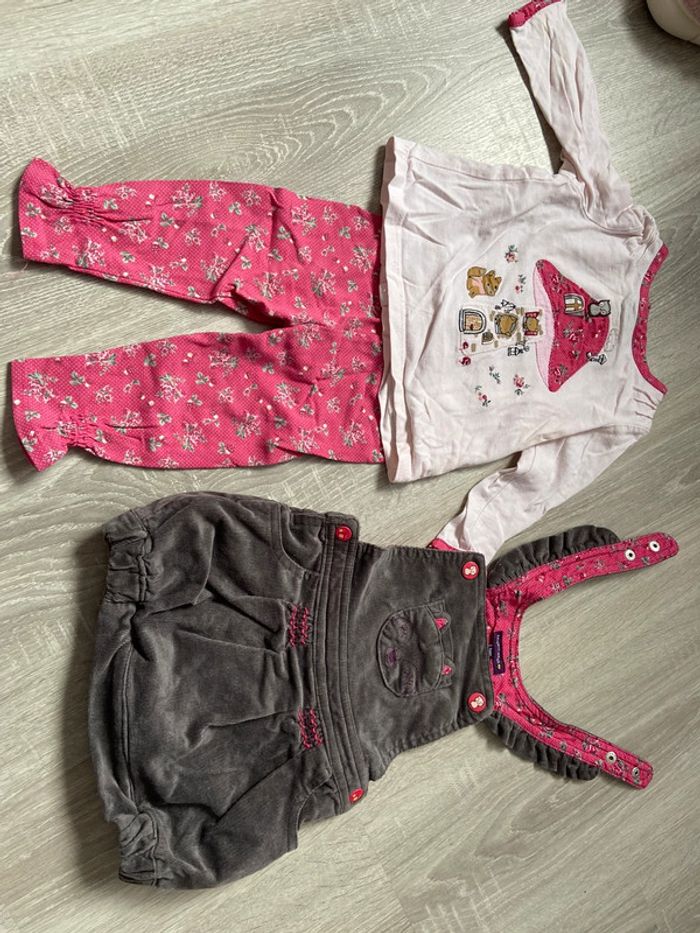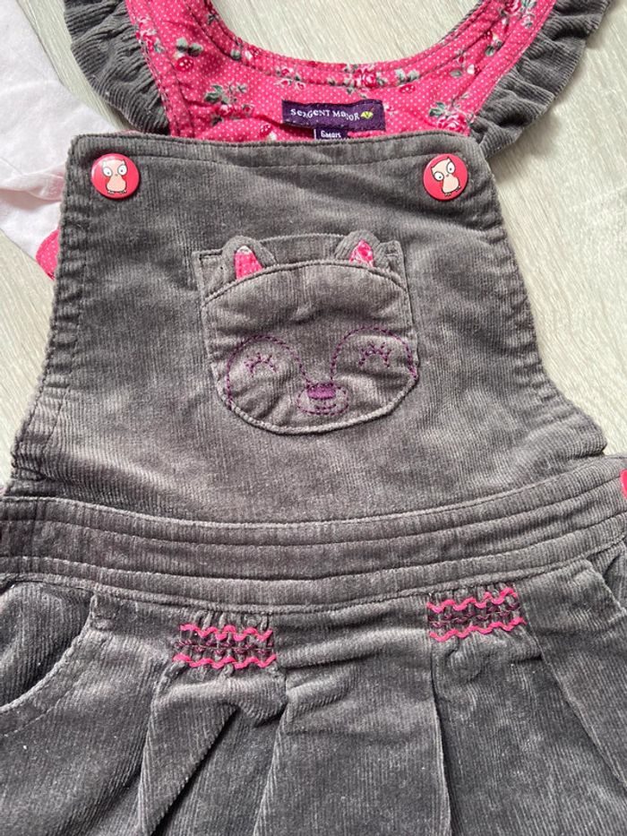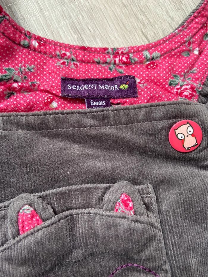 Tbe peu porté voir quasi neuf Ensemble sergent major 3 pièces parfait mi saison hiver 1 t shirt fleurs liberty et renard rose fermeture pression dos 6 mois 68 cm 1 legging assorti fleurs liberty rose et vert 6 mois 68 cm 1 robe salopette velours epaisse chaude 6 mois assortie gris et rose