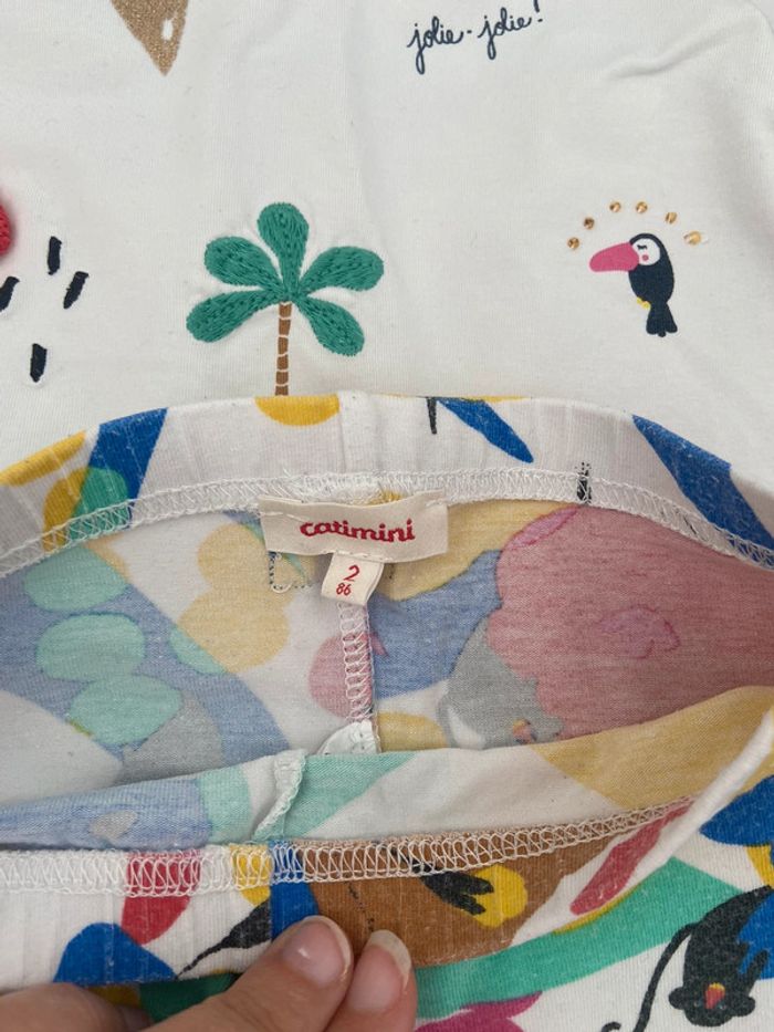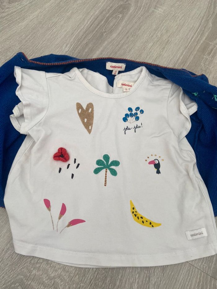 Catimini 2 ans 86 cm fille 1 gilet bleu lurex brillant motif peroquet parfait état quasi neuf 1 t shirt blanc motif estival parfait état quasi neuf 1 legging multicolore légèrement blanchi pourtant peu porté très bon état