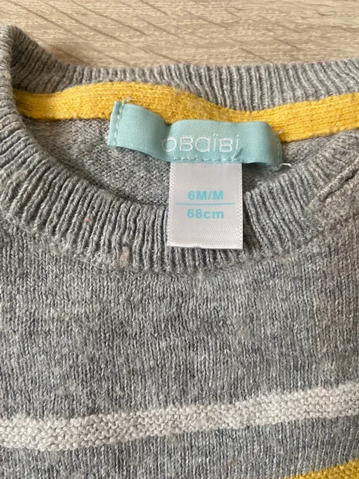 Quasi neuf Pull bébé gris marinière blanc et jaune 6 mois bebe garçon ou mixte