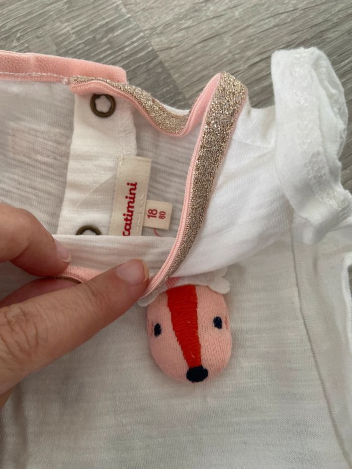Neuf jamais portée juste lavée Très belle Robe manche courte catimini motif renard haut blanc col brillant et bas multicolore Taille 18 mois 80 cm