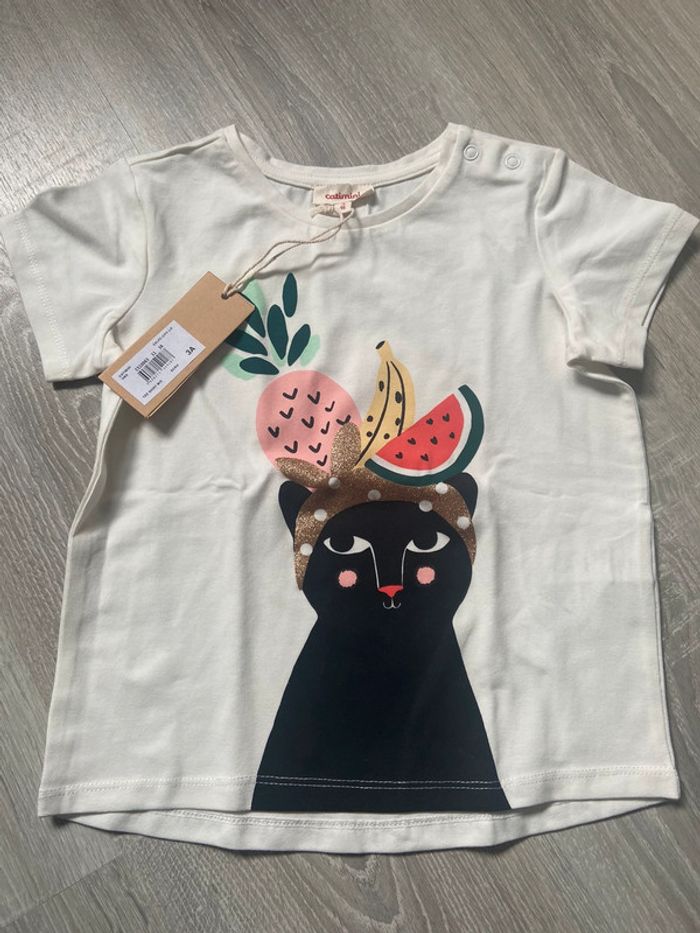 Neuf avec etiquette Jamais porté T shirt fille blanc manche courte catimini 3 ans 98 cm Motif panthère noir et fruits avec doré