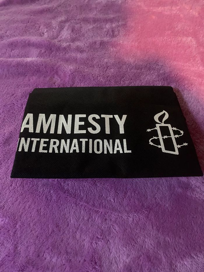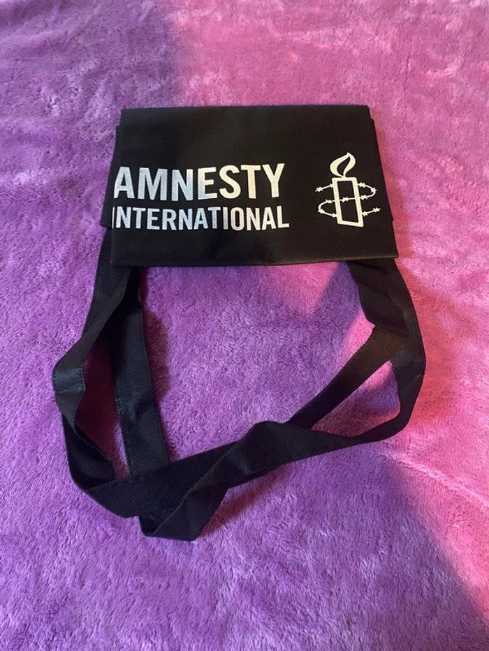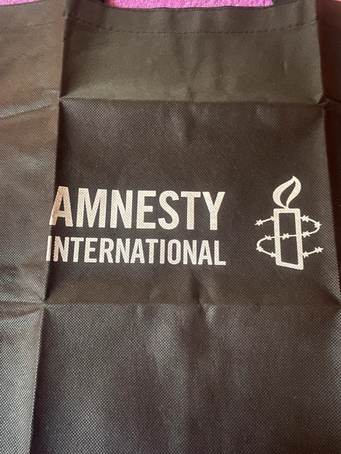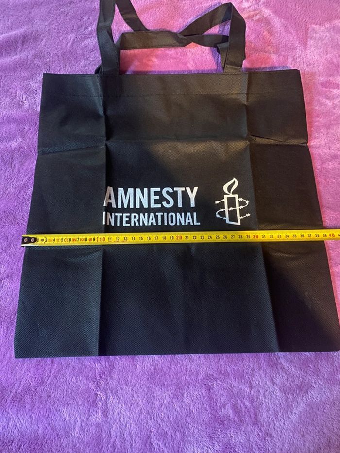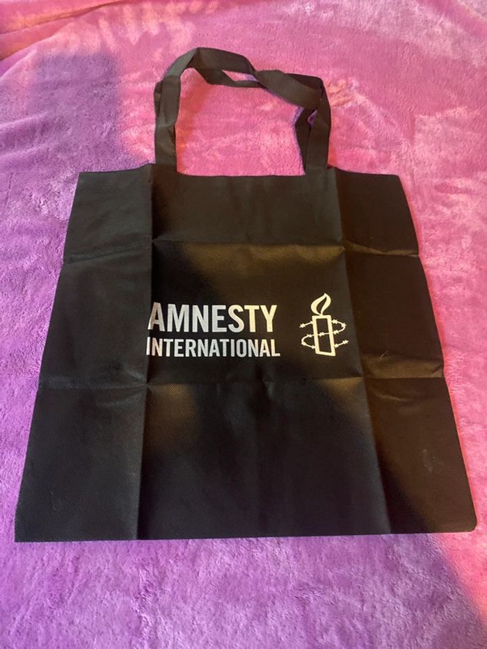 sac léger noir à bandoulière inscription"AMNESTY INTERNATIONAL"