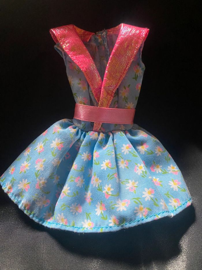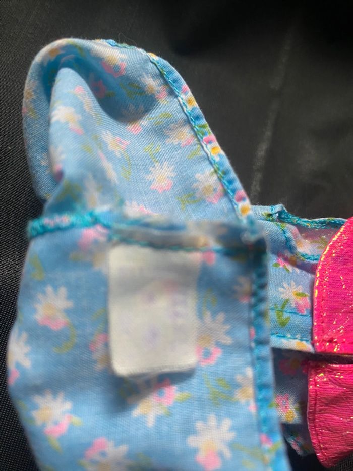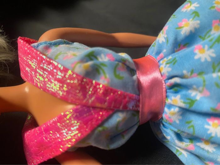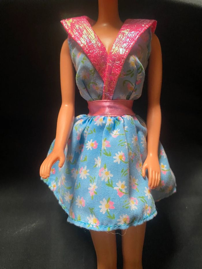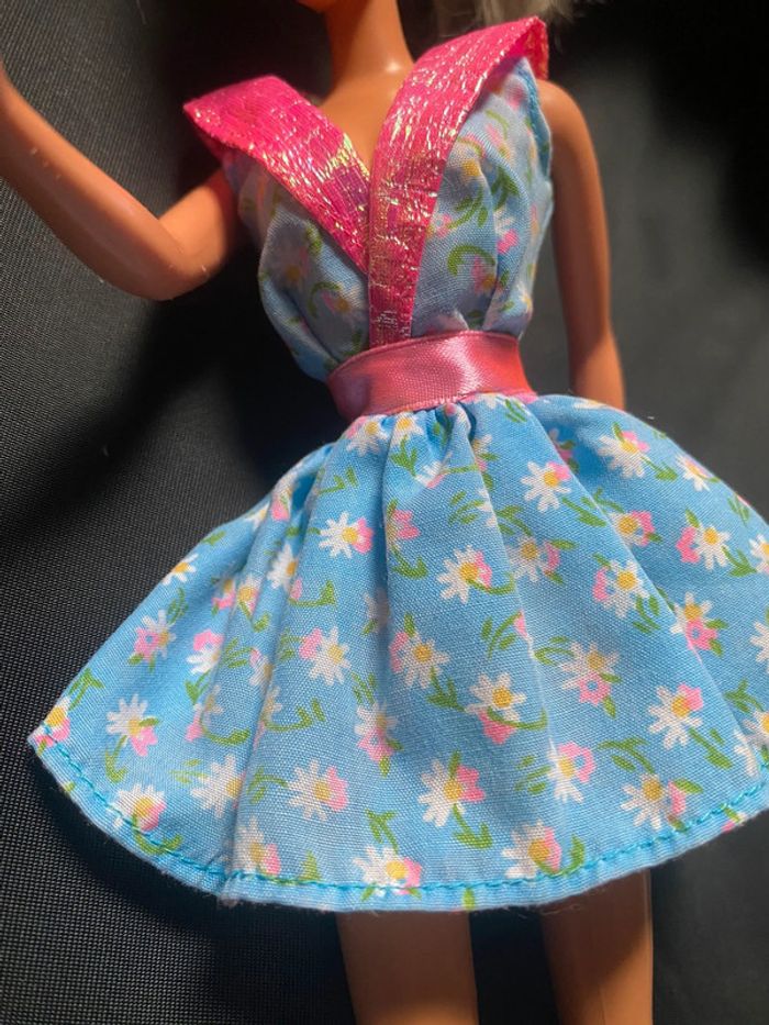 Robe barbie fashion mode carte de vœux fleurs marguerites bleues et roses mattel 1994 étiquettes inscription presque effacée