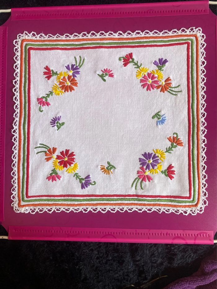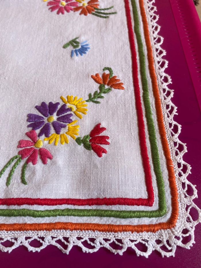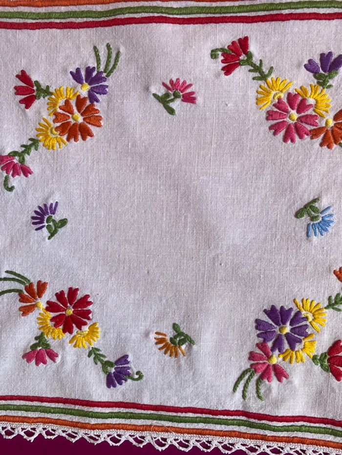 Vintage petit napperon brodé fleurs. J’ai un doute concernant la matière ça ressemble à du lin mais c’est peut-être du coton. Dimension 29 par 27 cm