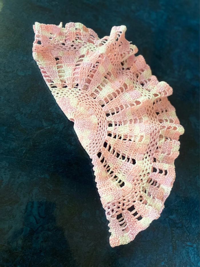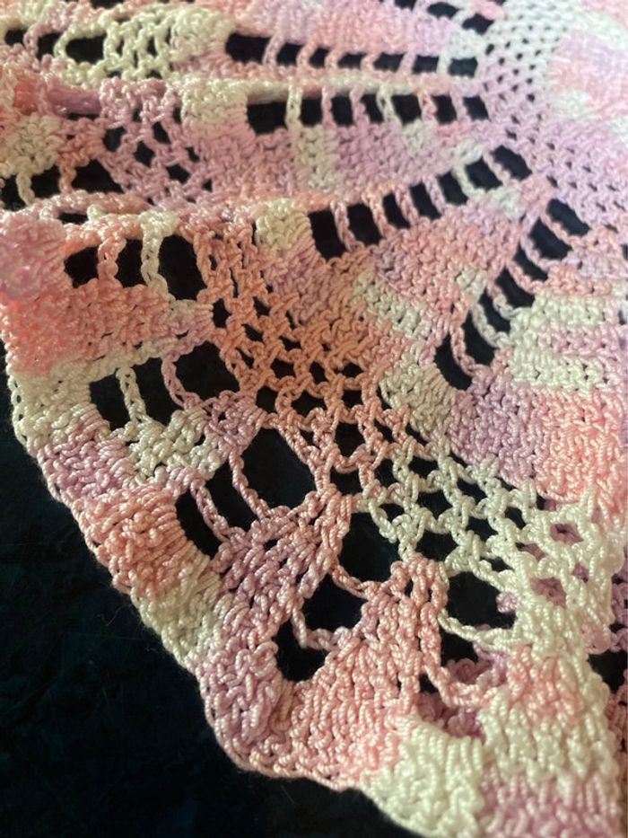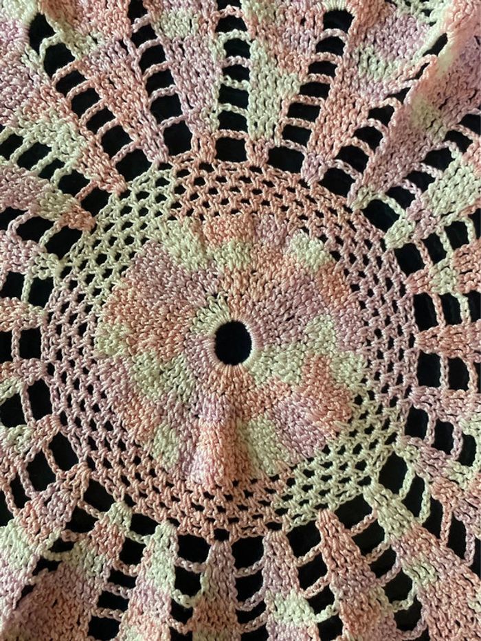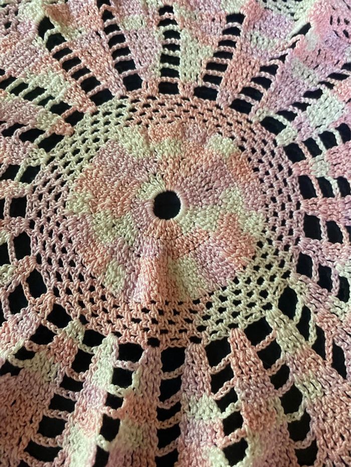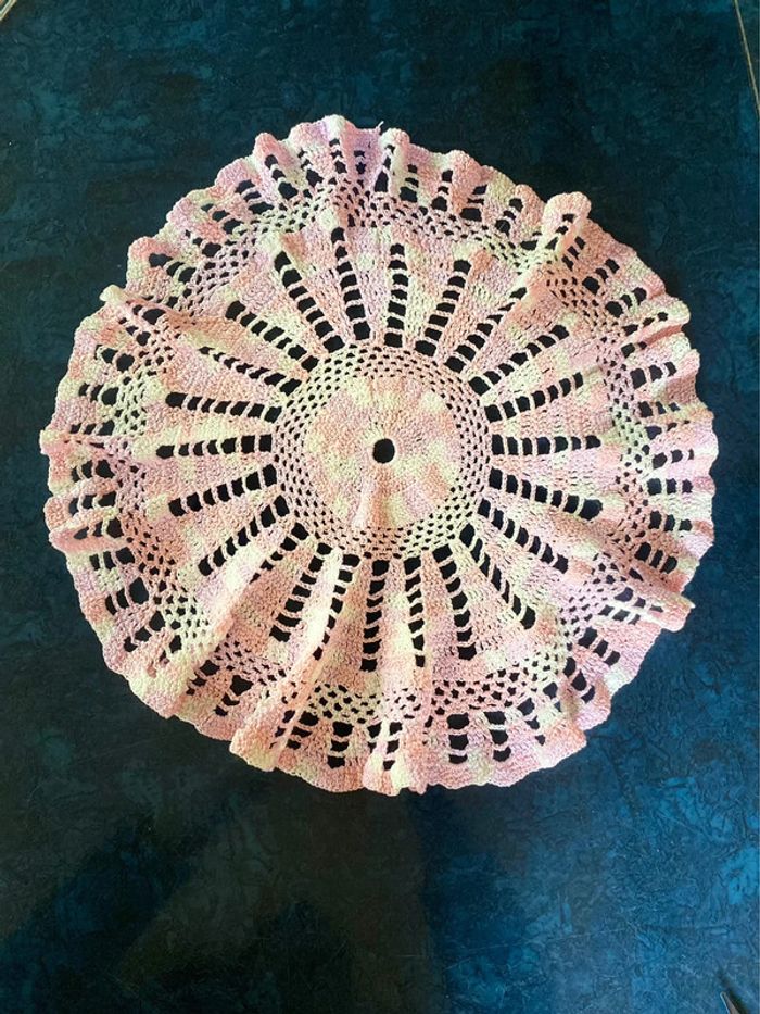 Napperon brodé, rose et blanc. Diamètre 42 cm