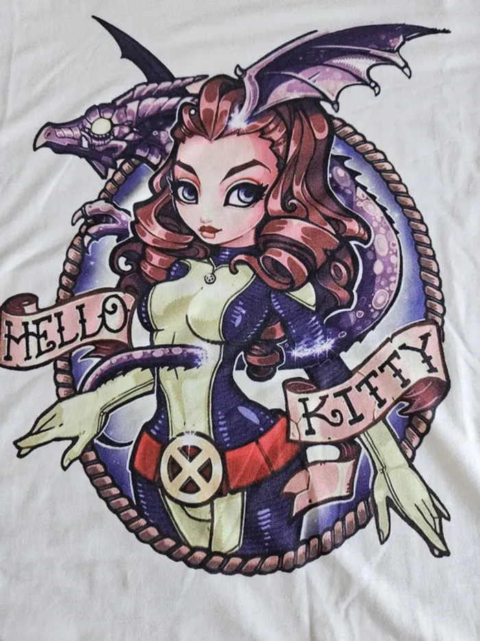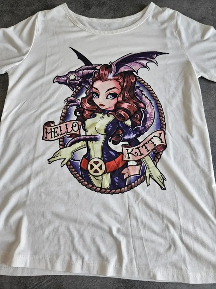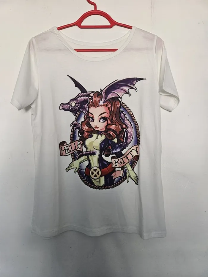 T-shirt à manches courtes Coupe femme Coloris blanc Col rond Motif d'une femme et d'un dragon sur l'avant du t-shirt Avec écriture "Hello Kitty" Marque : sans marque Composition : 96% polyester, 4% élasthanne Taille : 34 / XS. Mesures sur demande Etat : Neuf sans étiquette. Reçu en cadeau mais c'était trop petit pour moi. Envoi ou remise en main propre Pour voir des annonces similaires : #robotick_manches_courtes #robotick_taille34 #tshirtfemme #hellokitty #taille34 #neufsansétiquette #tshirtfemmeneuf