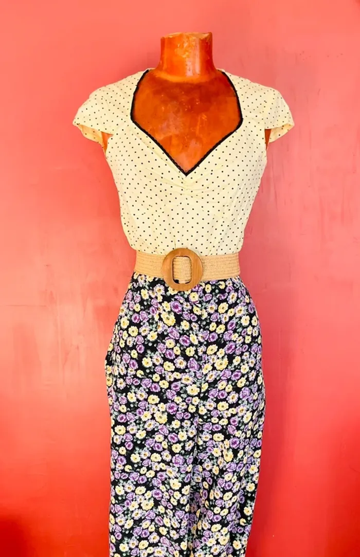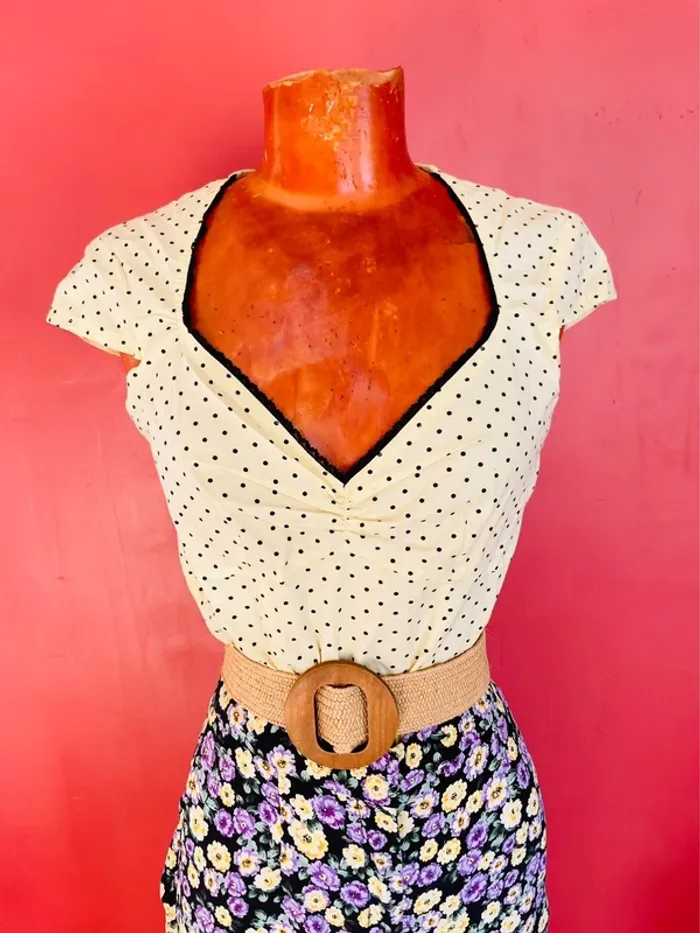 Élégant top jaune à dentelle et pois noirs