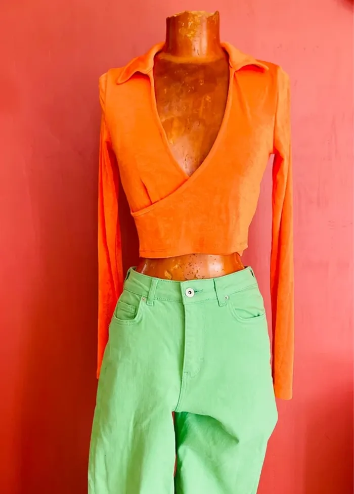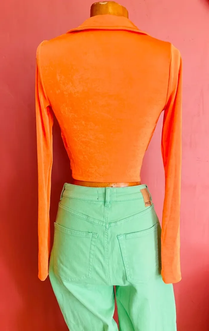 Magnifique haut crop orangé vitaminé Manches longues Cache cœur avec col Pour tailles 36-38 #ac2107taille36 #ac2107haut #top#croptop#oranglefluo