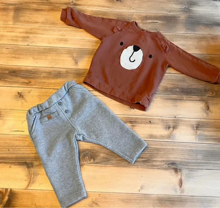 Ensemble pantalon molletonné gris et pull ourson 12 mois