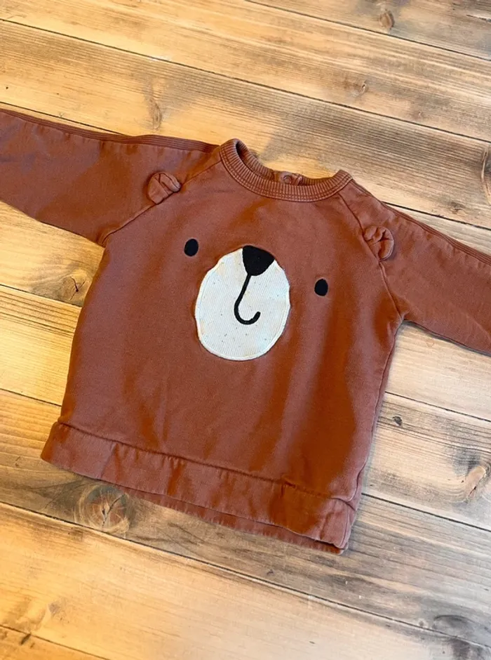 Joli ensemble composé de: - un pantalon gris molletonné - un pull marron, tête d’ourson Taille 12 mois #ac2107garçon12mois