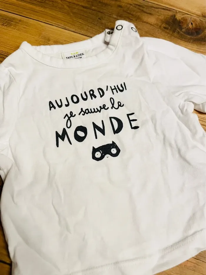Lot composé de: - un tee shirt manches longues blanc avec message - un tee shirt blanc cassé avec motifs - un pantalon large bleu marine Taille 3 mois #ac2107garçon3mois