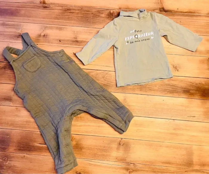 Joli ensemble composé de: - une salopette bien chaude kaki - un tee shirt manches longues et col roulé, kaki plus clair Taille 9 mois #ac2107garçon9mois