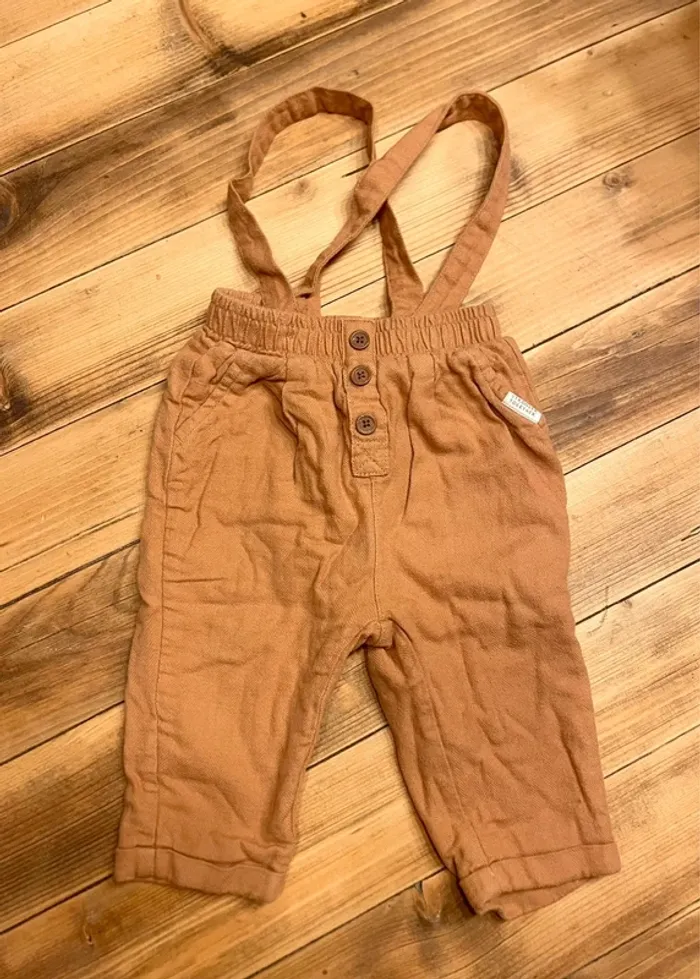 Très joli ensemble composé de: - une chemise épaisse, motifs pieds-de-poule, beige et marron - un pantalon épais, à bretelles amovibles, camel 100% coton Taille 9 mois #ac2107garçon9mois