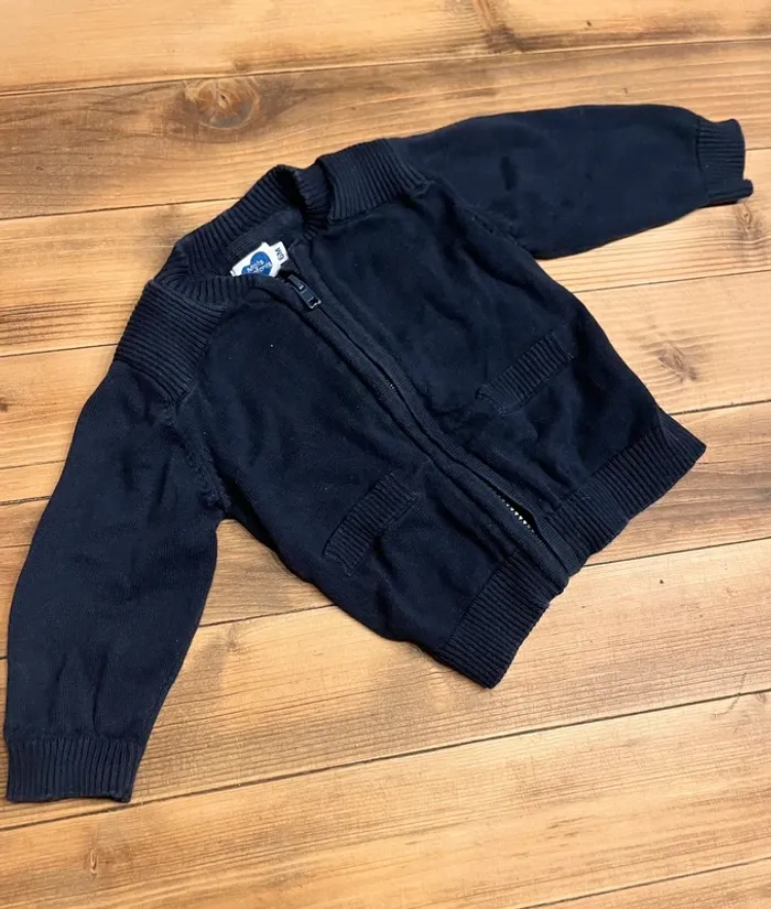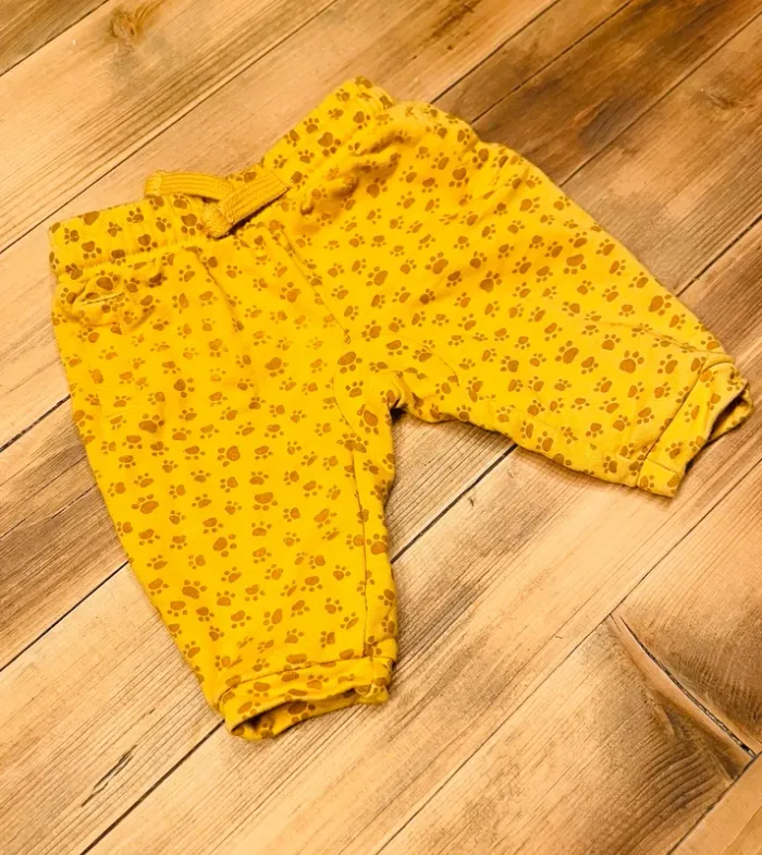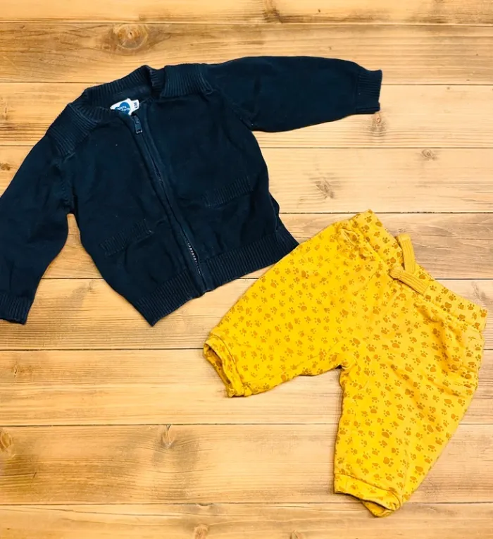 Petit ensemble composé de: - un gilet zippé bleu marine en coton - un jogging jaune moutarde avec motifs pattes de chien 🐶 Taille 6 mois #ac2107garçon6mois