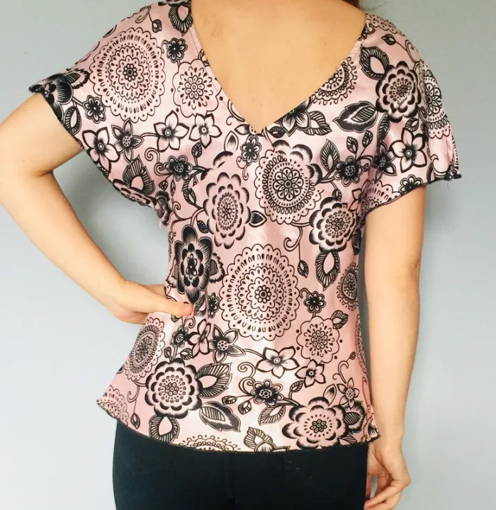très jolie tunique couleur rose-lilas avec motifs fleurs noirs col V devant et derrière manches courtes très agréable à porter fermeture éclair sur le côté taille 3 sur l’étiquette mais taille plutôt comme un 38 #ac2107haut #ac2107taille38 #vintage#japan#asiastyle