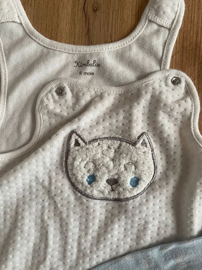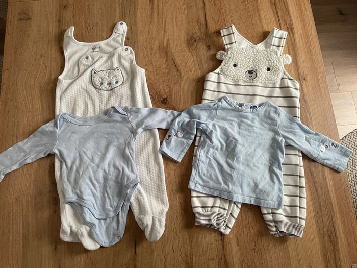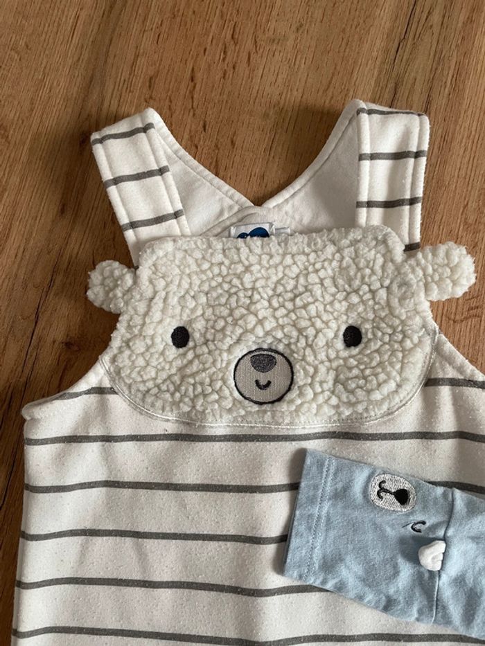 Lot de 2 salopettes + tee shirt manche longue + body. La salopette blanche va avec le body bleu clair. La salopette rayé a l'intérieur un peu polaire elle tient bien chaud. Réductions lots activés.