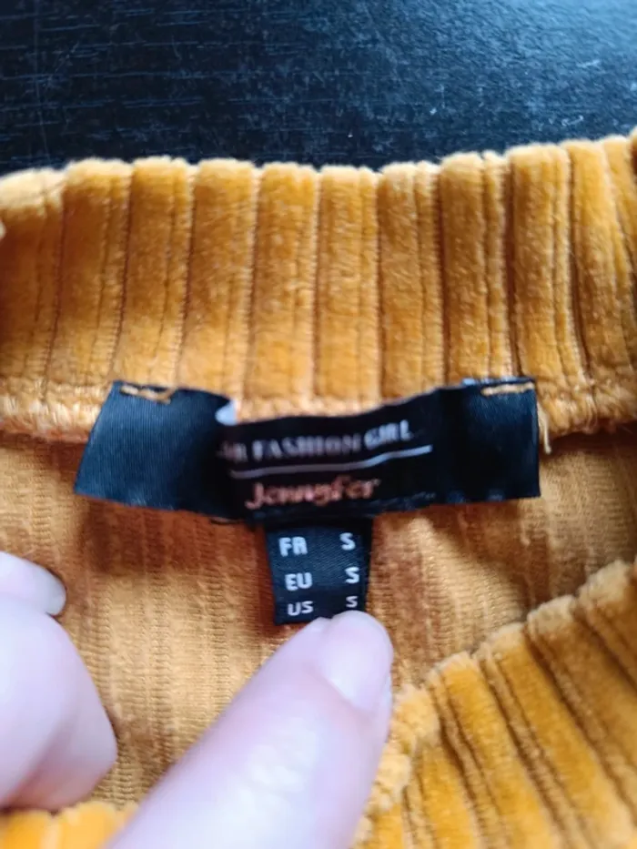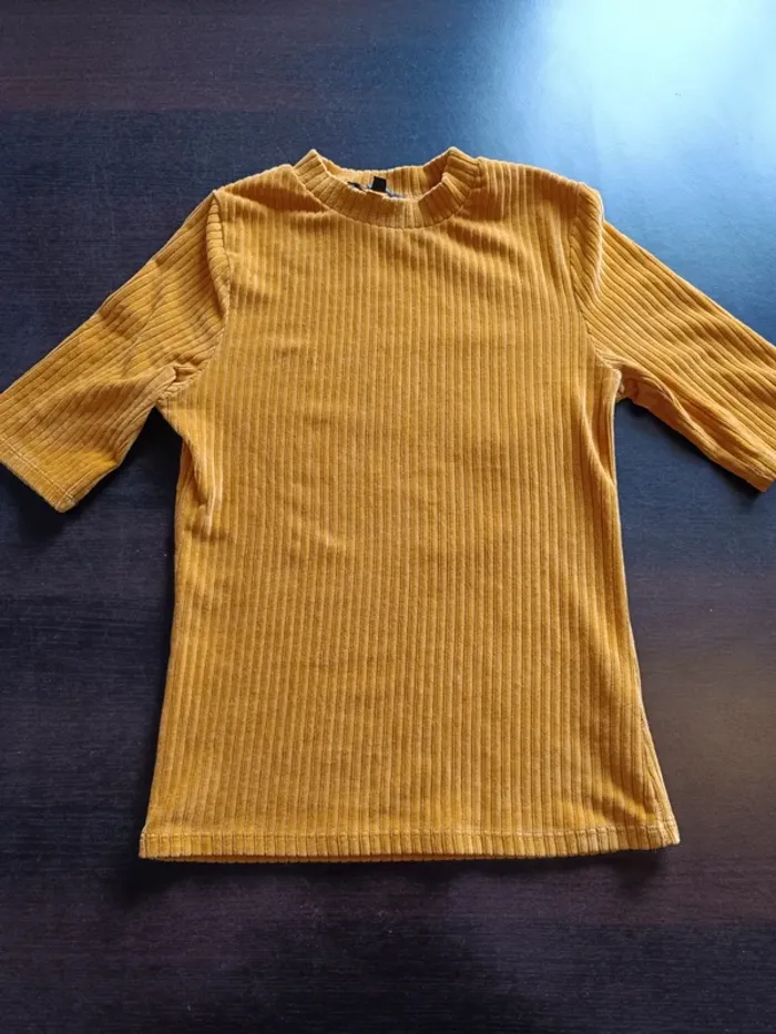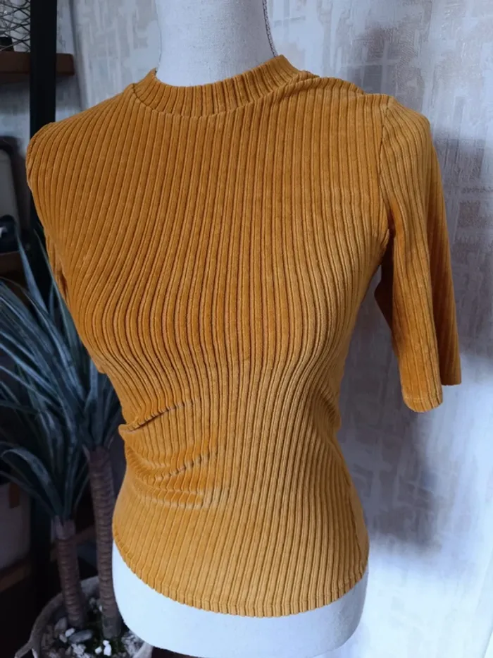 Haut JENNYFER Moutarde Col montant & manches courtes 65% Coton, 31% Polyester & 4% Elasthanne TAILLE S TRES BON ETAT Allez voir mes autres ventes!