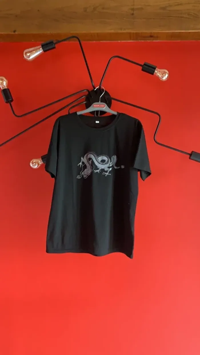 Vends ce teeshirt homme à manches courtes en noir avec un transfert gris argent sur la poitrine représentant un dragon 🐉 . Uni au dos