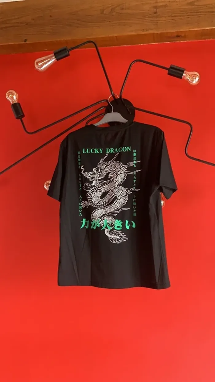 Vends ce teeshirt homme manches courtes de couleur noir logo dessin et écritures vert et blanc . Taille L . En 35 % coton et 65% polyester .