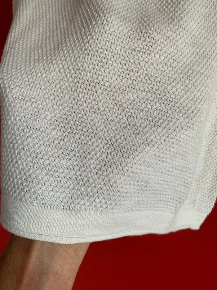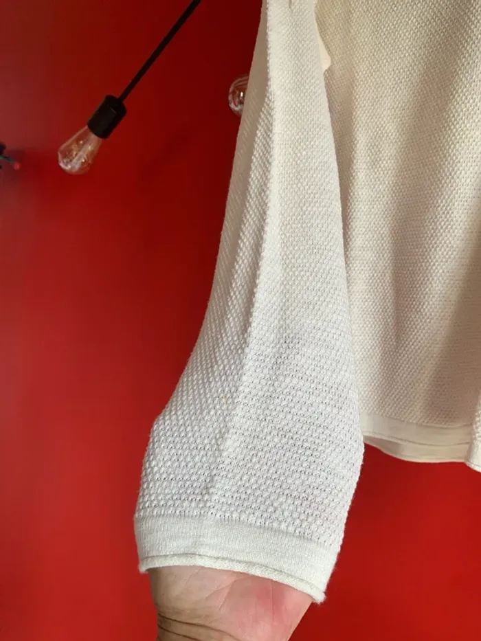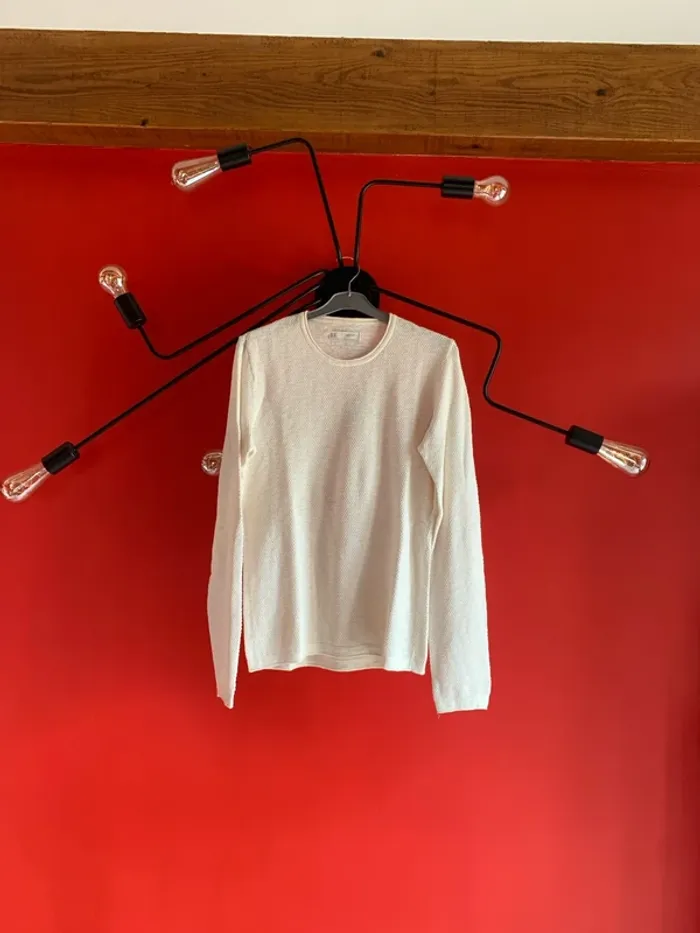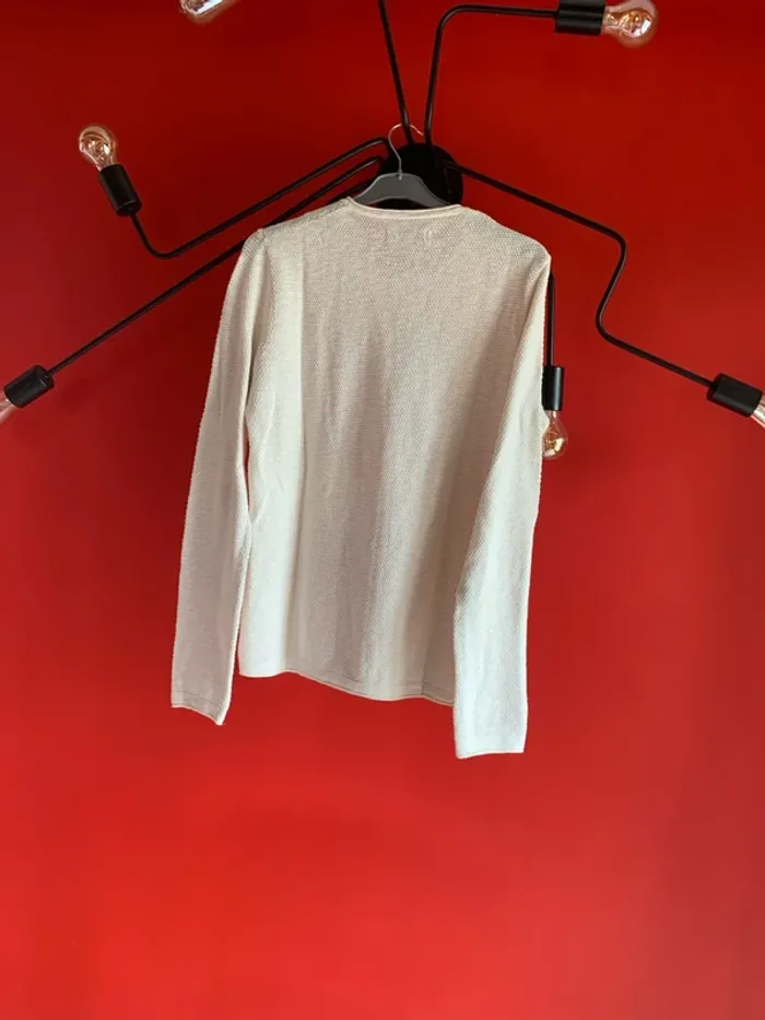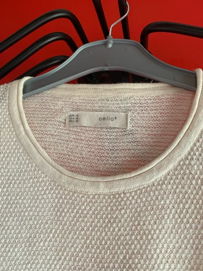 Vends ce très joli teeshirt homme de chez Celio . Il est en taille M . En maille ( fin ) pour vos soirées d’été . Couleur blanc cassé ( crème ) . Manches longues