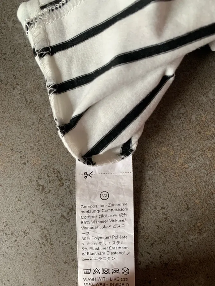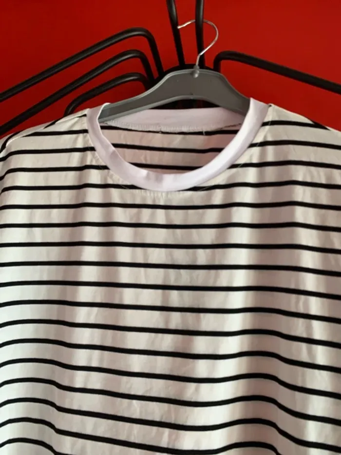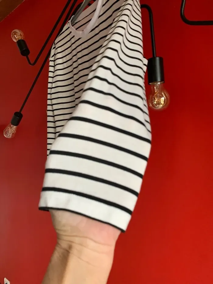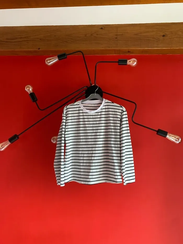 Mignon petit tee-shit marin femme à manches longues taille 36 . Col rond . Couleur blanc cassé sauf le col blanc. Se porte ample 😉. Longueur des manches 49 cm .