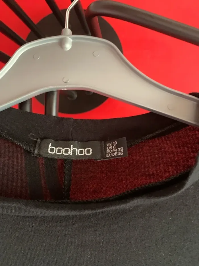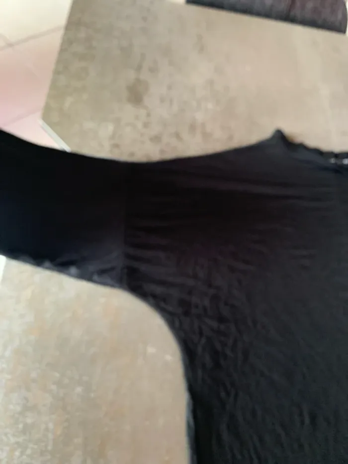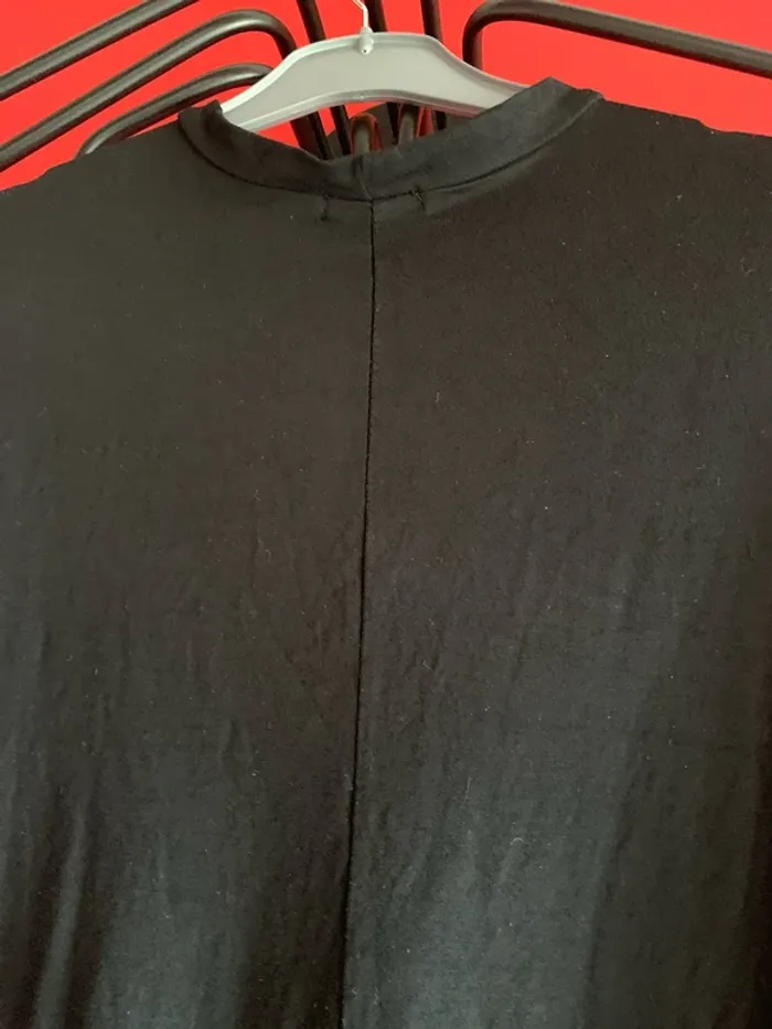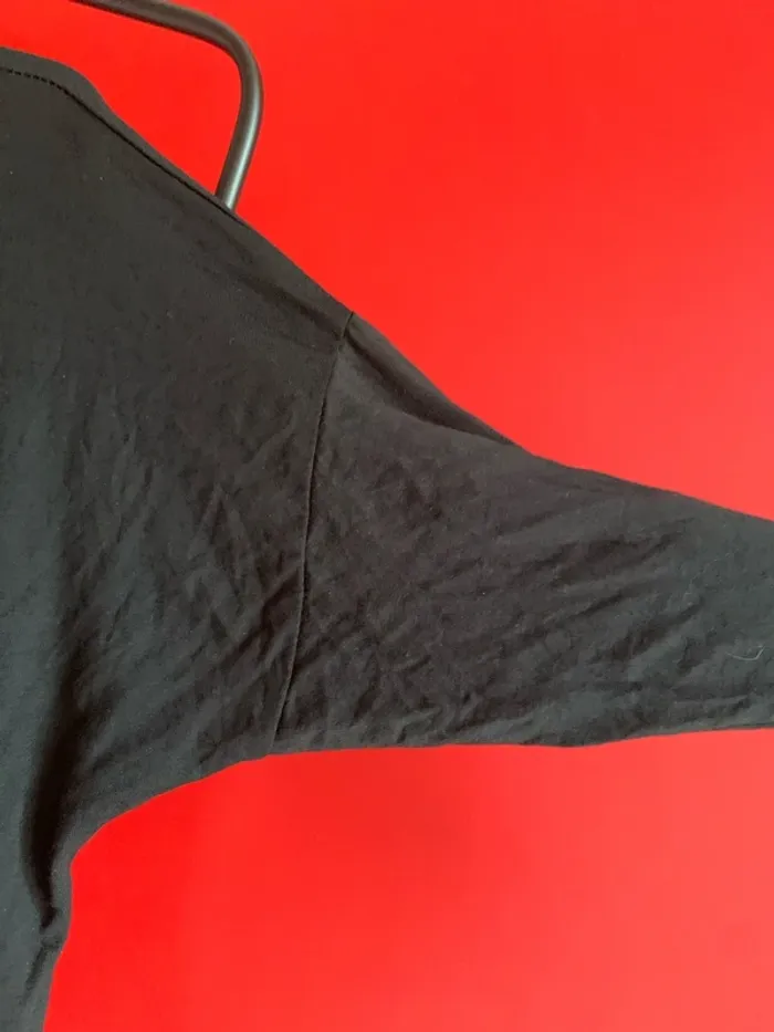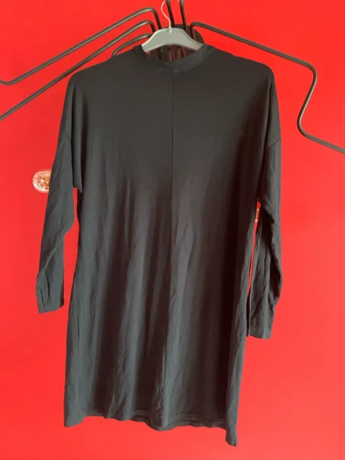 Vends cette robe tee- shirt manches longues ( tunique) . Taille 38 de couleur noire … 79 cm de long ; d’une couture épaule à l’autre je ne peux pas mesurer puisque couture plus basse que l’épaule ( voir photo 2 et 3 ) . Couture au milieu du dos d’agrément horizontale ( voir dernière photo ) .