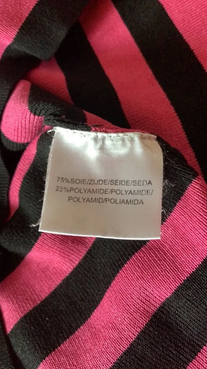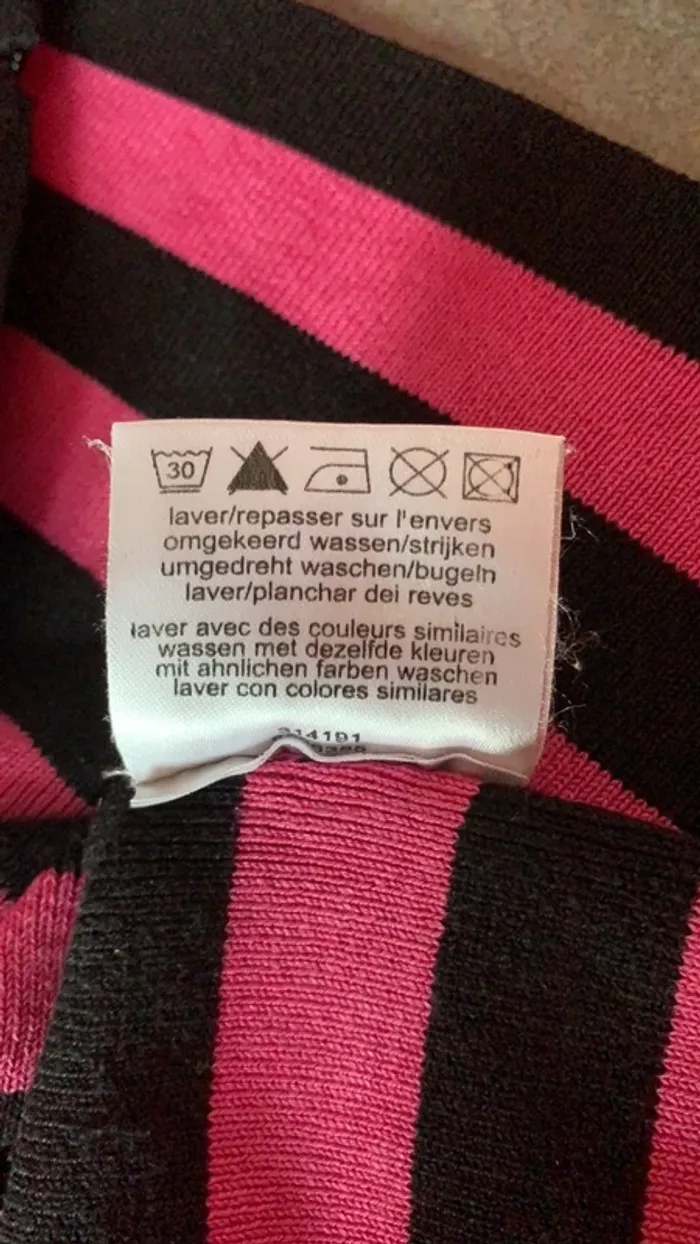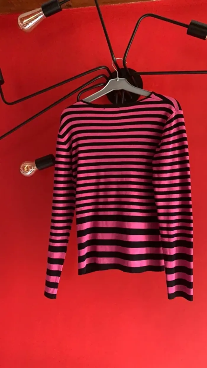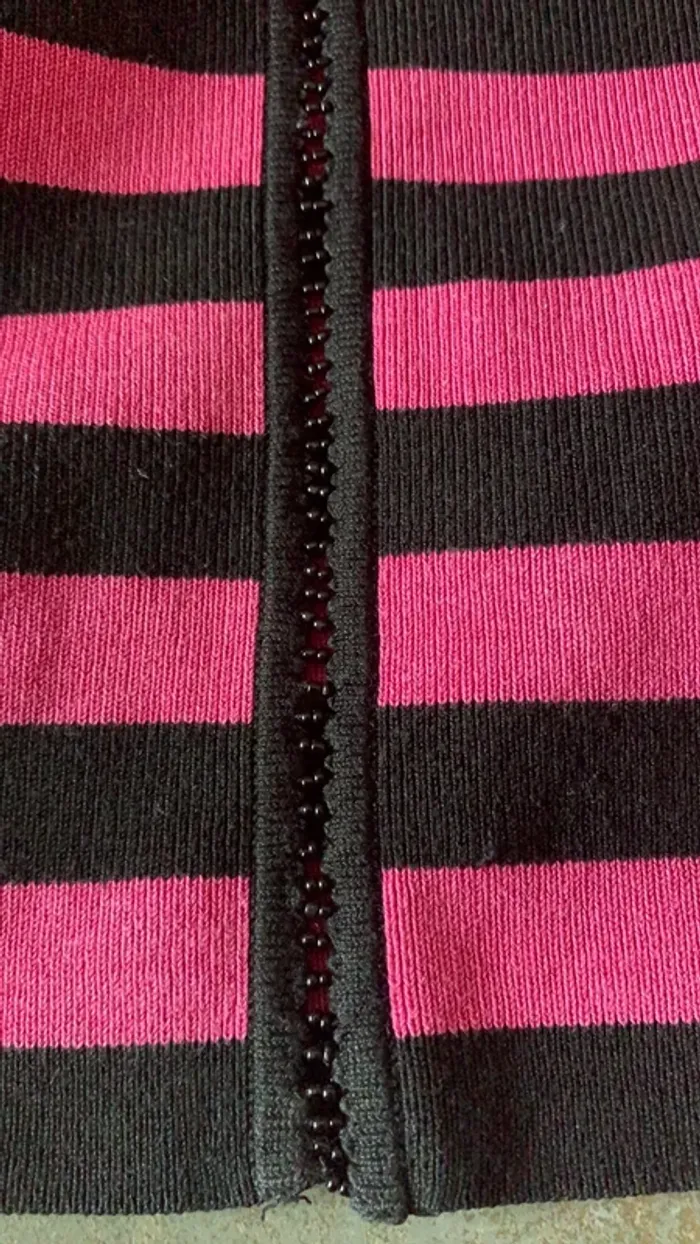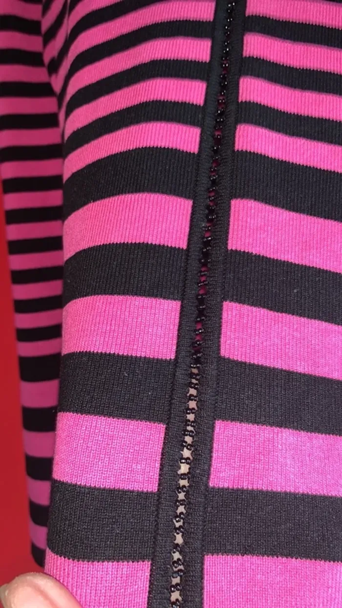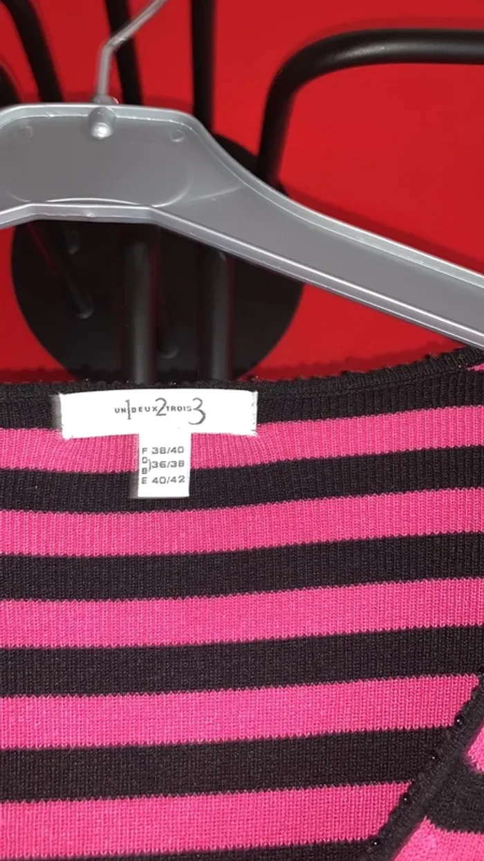 Vends ce pull rose fushia et noir rayé de chez 123 . Col V rehaussé tout le tour de petites perles noirs , tout comme au milieu ( cela ne s’ouvre pas , le pull s’enfile) 😉👍. Il est en 38/40 en 75% Soie et 25% Polyamide . Longueur des manches : 58,5 cm . Longueur totale de pull : 57 cm ( prise bord de cou jusqu’en bas )