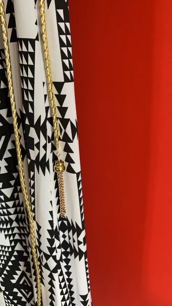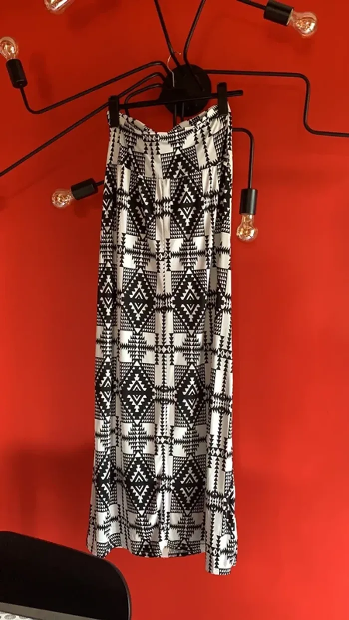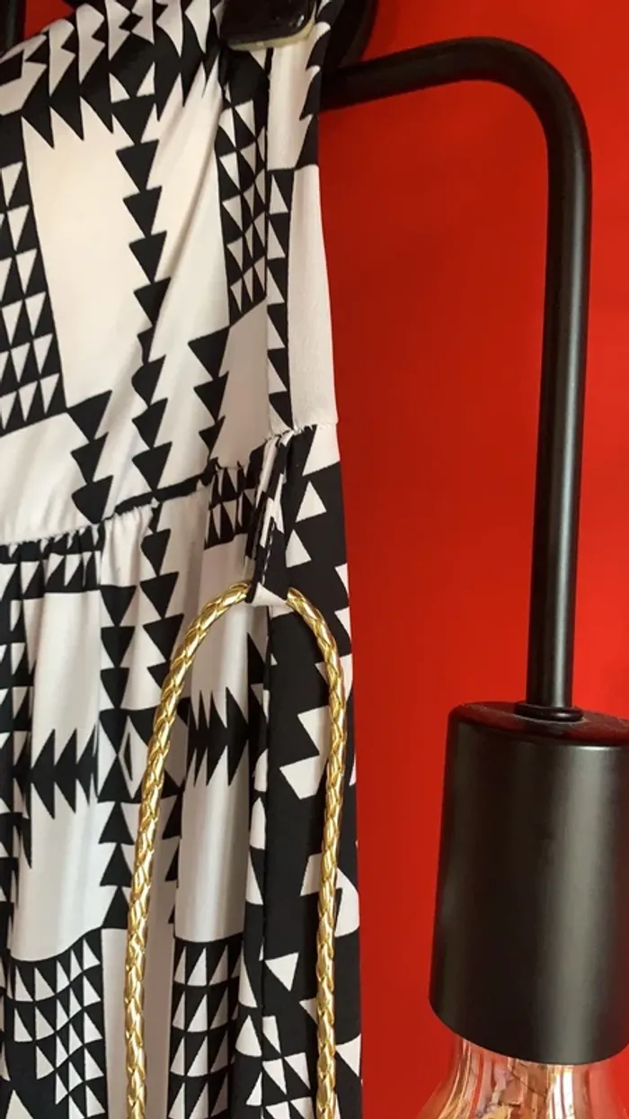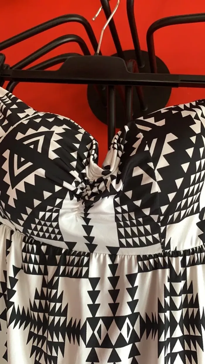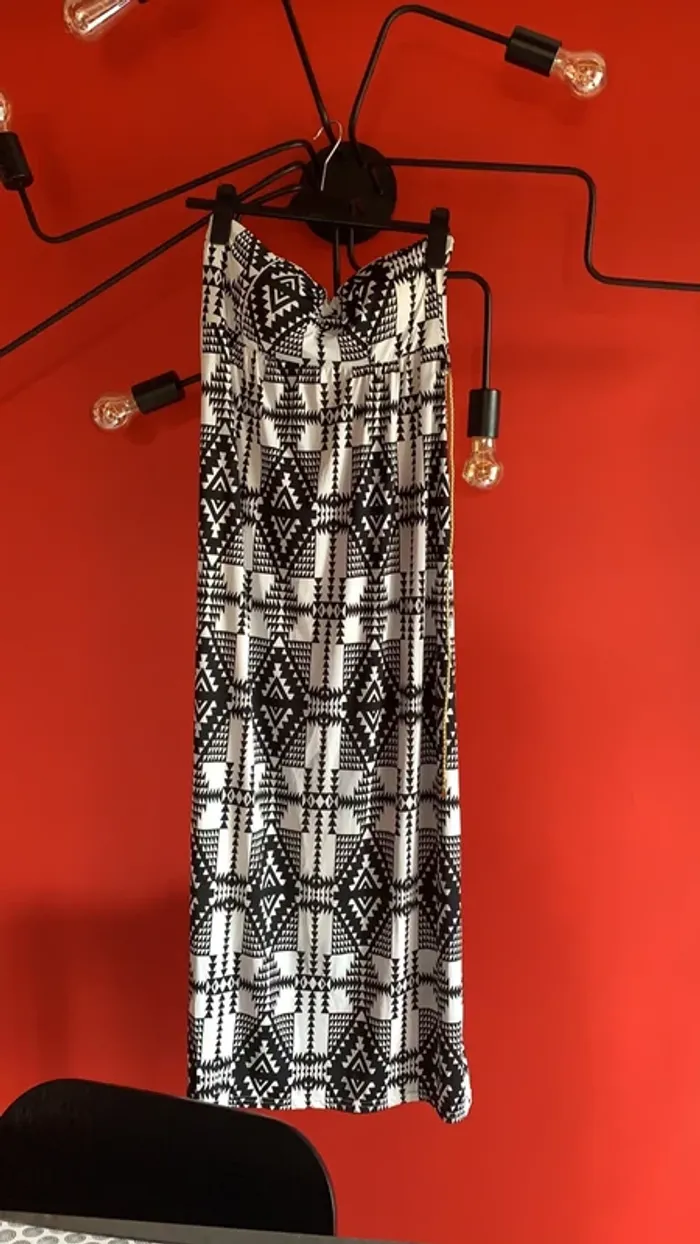 Vends une robe bustier noir et blanc décor géométrique en taille 38/40 . Elle est en synthétique ( 95% polyester , 5% élasthanne) .poitrine avec coques à l’intérieur du tissu . Fronces au centre de la poitrine . La ceinture il faut en mettre une autre , j’ai perdu la breloque qui était accrochée 🧐……Tombe au cheville ( je mesure 1,67 cm ) . 120 cm de long