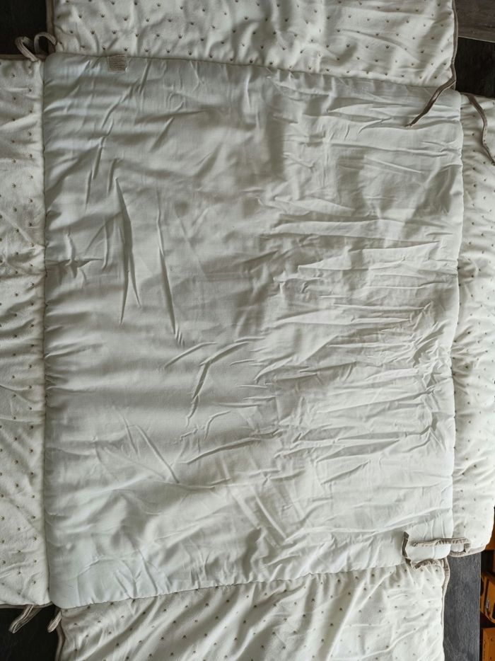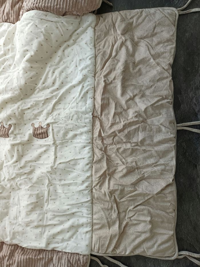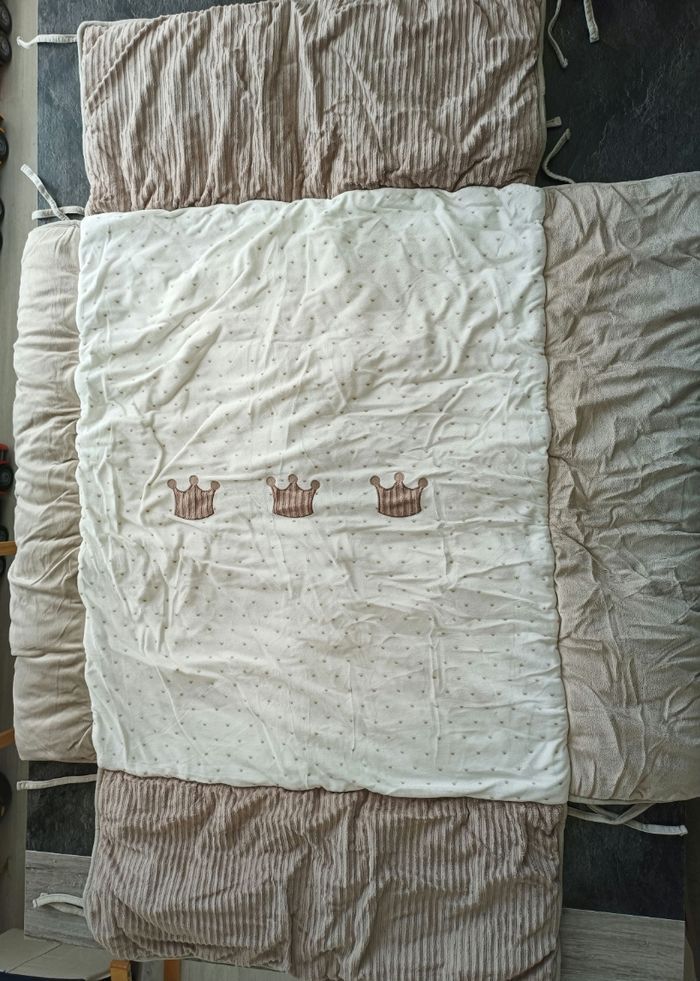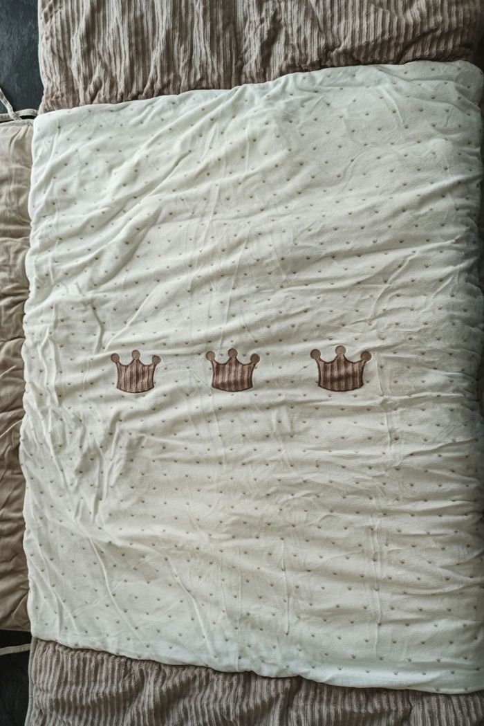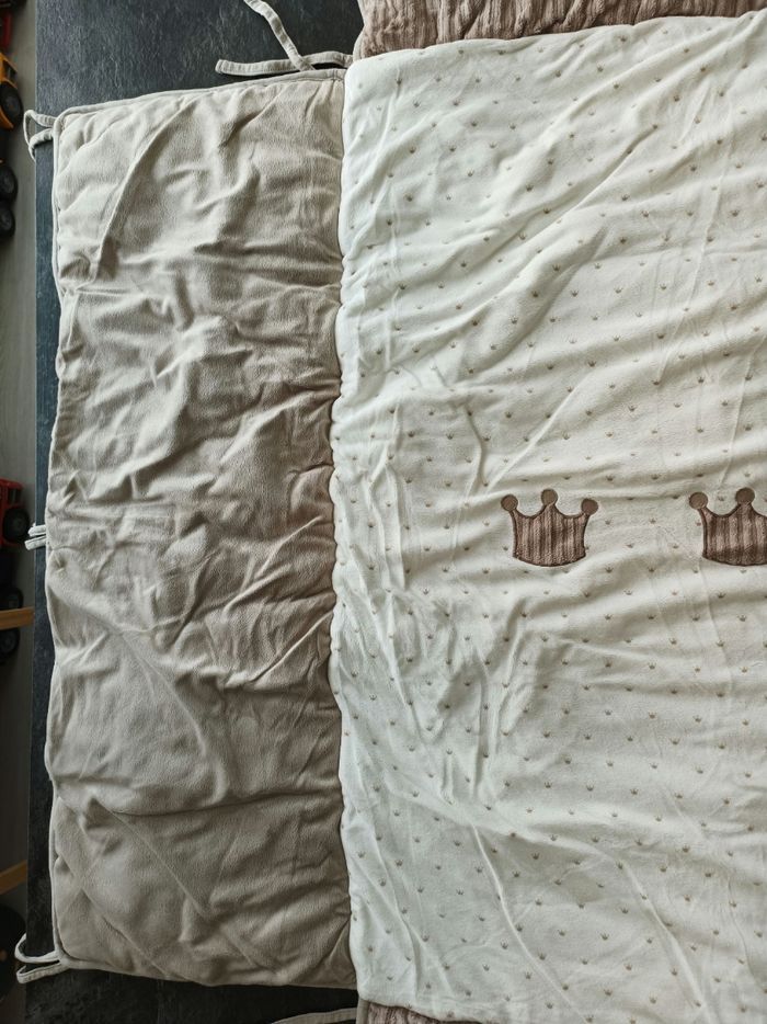 A vendre Tapis de parc en excellent état 95cmx75cm Pas de trou pas de tâche Marque Nattou très bonne qualité Blanc cassé/marron motif couronnes 👑 Il a été posé dans le parc quelques mois seulement et a toujours été protégé et stocké dans le sac gris (voir dernière photo) D'autres articles de la même collection sont en vente sur mon profil 😊