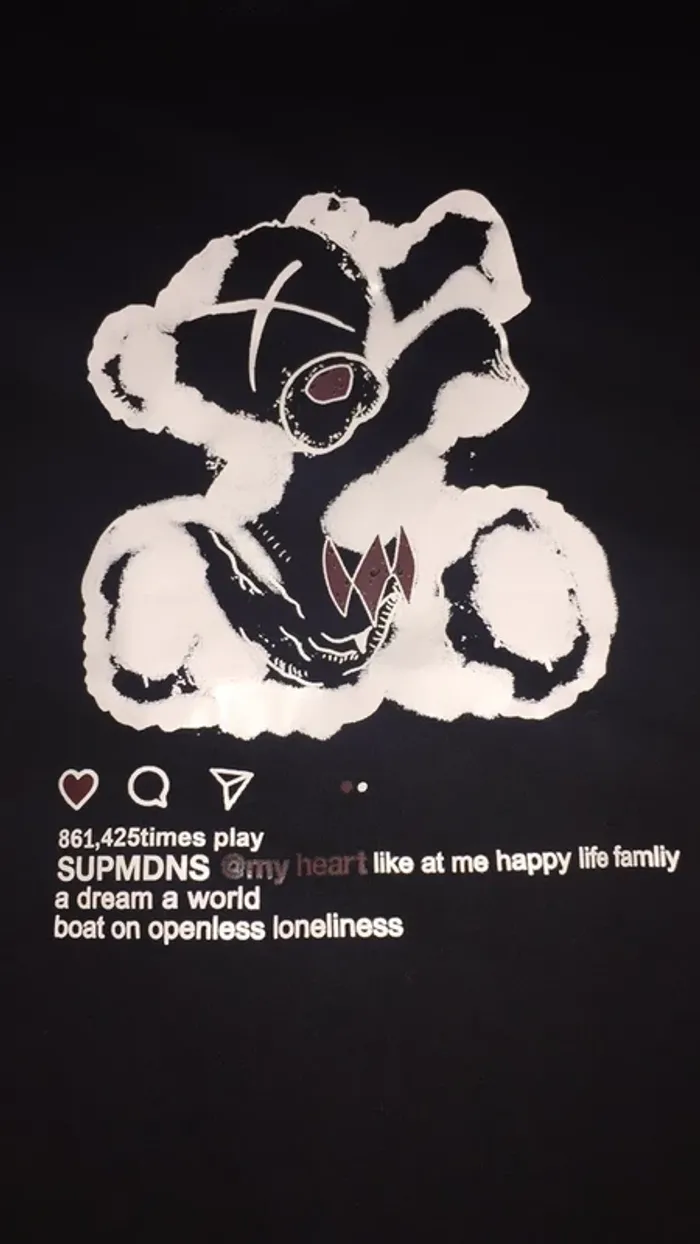 vends un teeshirt Oversize en taille M tendance: Décor poitrine Ourson en blanc 😏. 20% coton , 75% polyester, et 5% spantex . Mesures : D’un dessous de bras à l’autre : 58 cm . D’une couture épaule à l’autre ( dos) : 61,5 . Longueur du teeshirt de la nuque jusqu’en bas : 65,5 . Longueur des manches : 19,5 cm