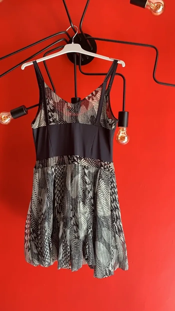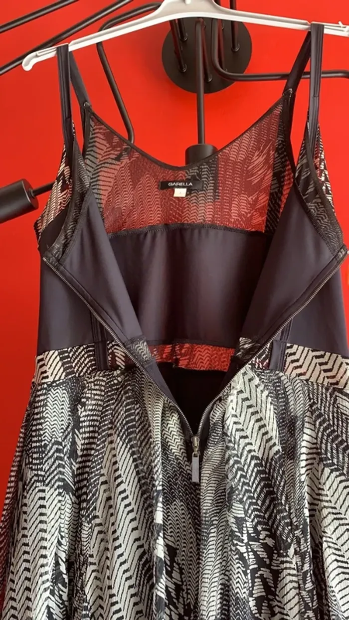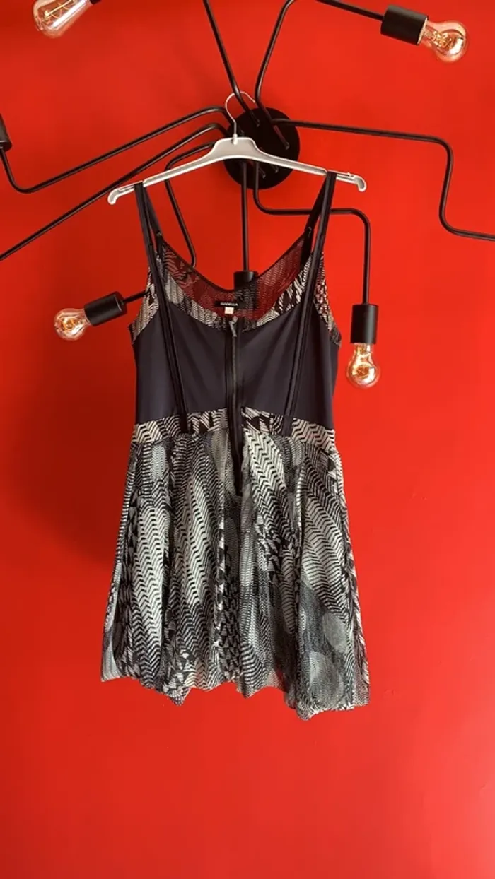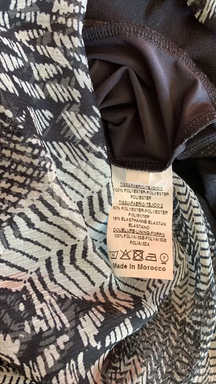 Vends une tunique à fines bretelles , avec fermeture éclair devant , en taille 3 ( M/L 40/42) . Trois tissus différents : 100% polyester pour les parties non unis , la partie du haut mélange polyester 82% et elasthanne18% . Puis la doublure en 100% polyamide 👍.peu également se porter en robe l’été et arrive au milieu des cuisses ( je mesure 1,67 cm )