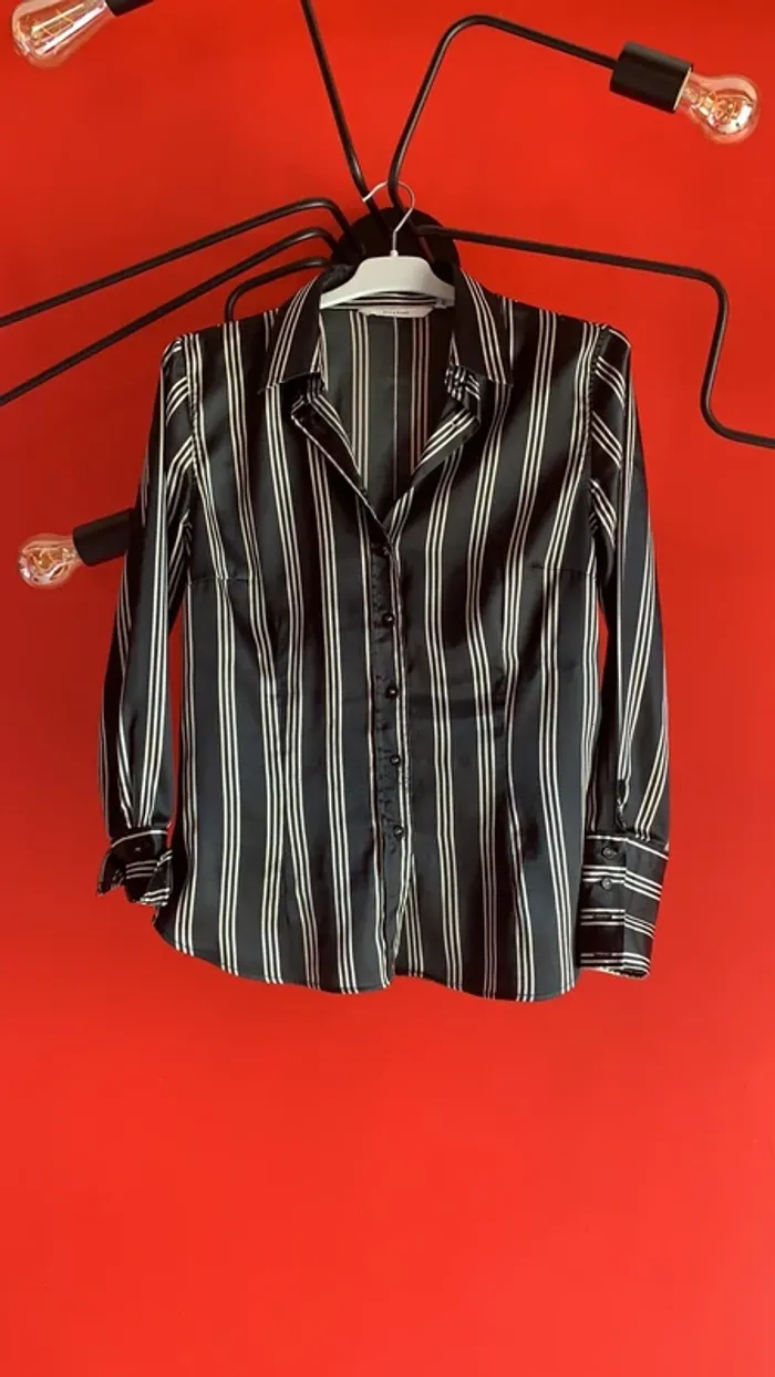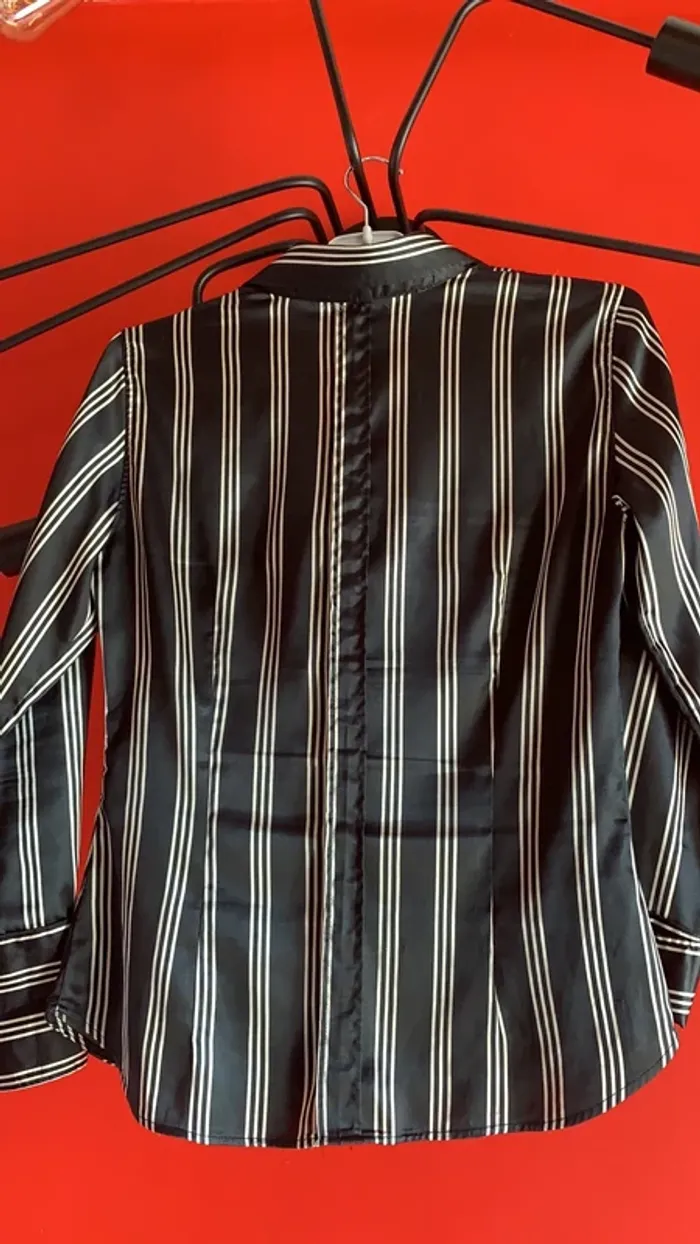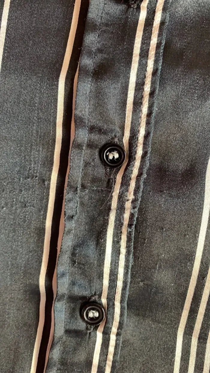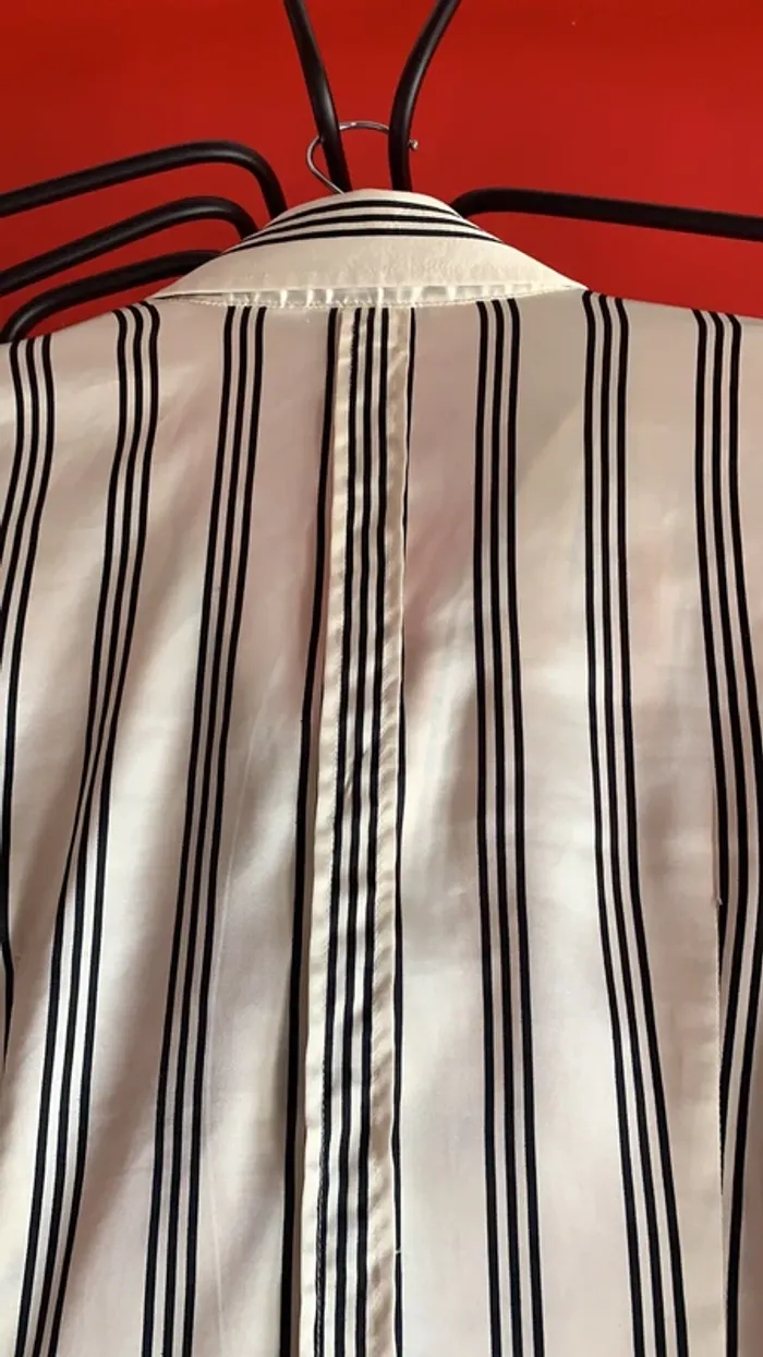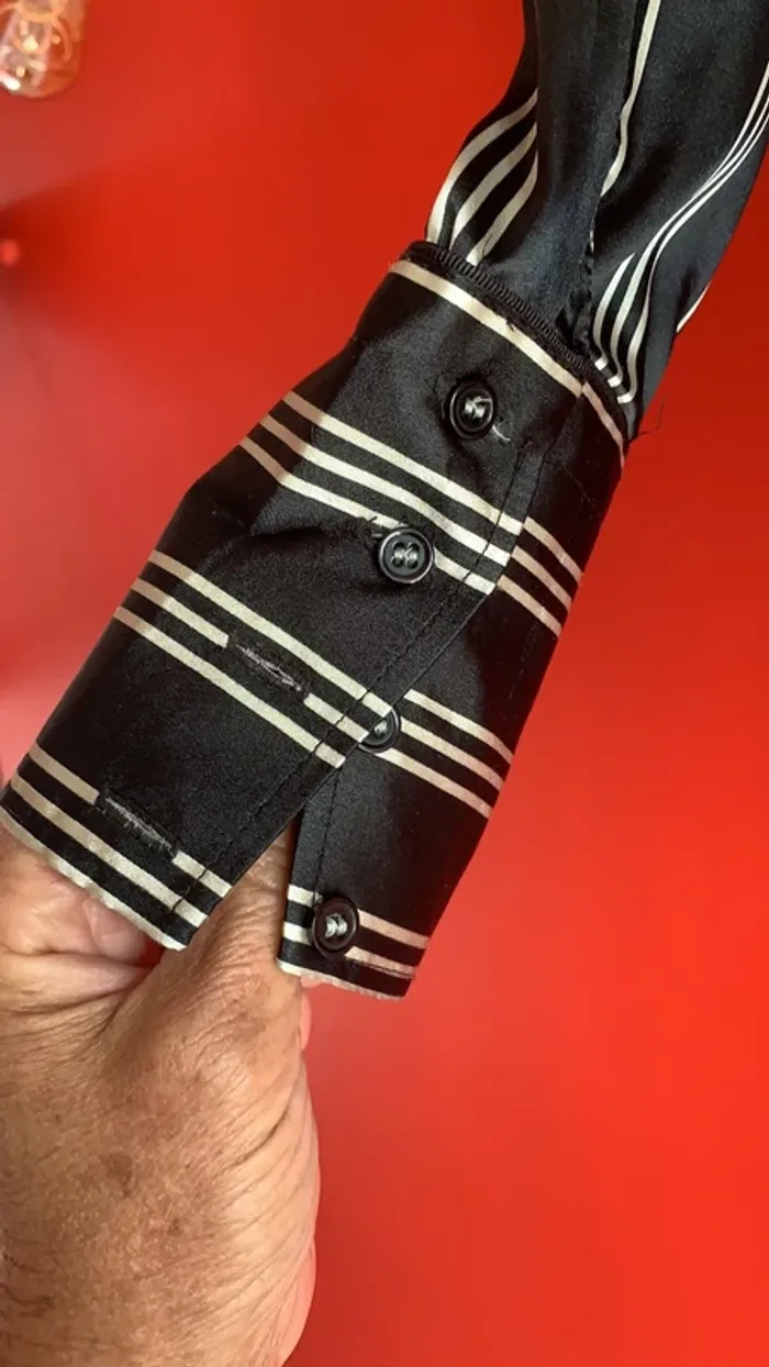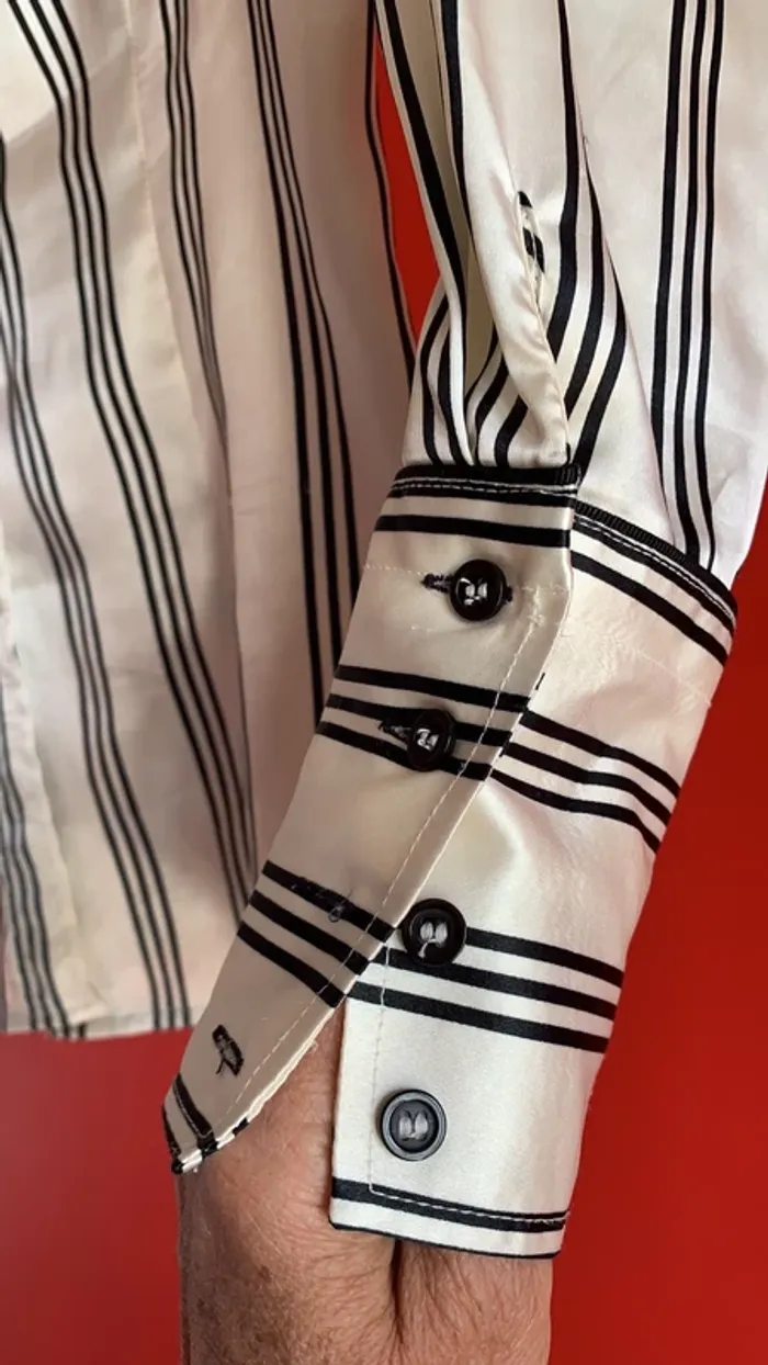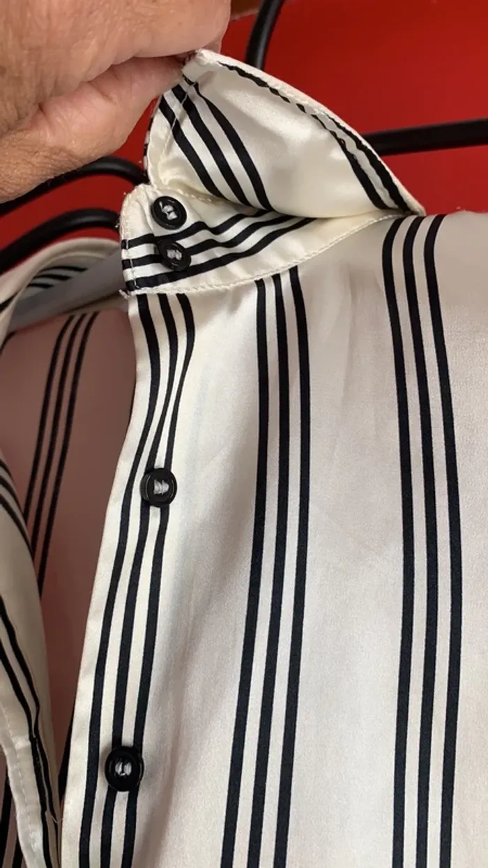 Vends un lot de deux chemisiers Zara ( un noir et un blanc ) à rayures horizontales en taille L tous les deux . Sont en 97 % polyester et 3% Spantex , et comme je les rentrais toujours dans mes bas , un est est usé entre le dernier et l’avant-dernier bouton devant pour le noir ( voir photo 2 ) , et le blanc à eu un fil d’étiré , et à donc un petit accroc à l’arrière en bas où je le rentrais également 🙄😬( photo 12 ) . Ils sont satinés . Pliure à l’arrière au centre , quatre boutons aux manches , deux sur la partie col ( je ne les portais jamais boutonné jusqu’en haut , mais plutôt ouverts) 😄 ! Environ 62 cm de long mesure prise de dos sous le revers col jusqu’en bas au centre . Légèrement arrondis en bas . Pinces poitrine
