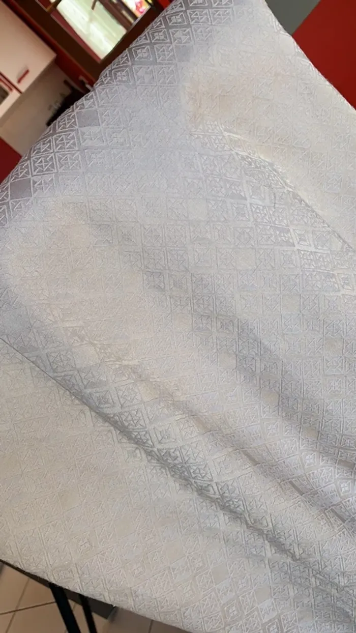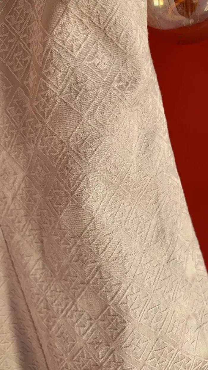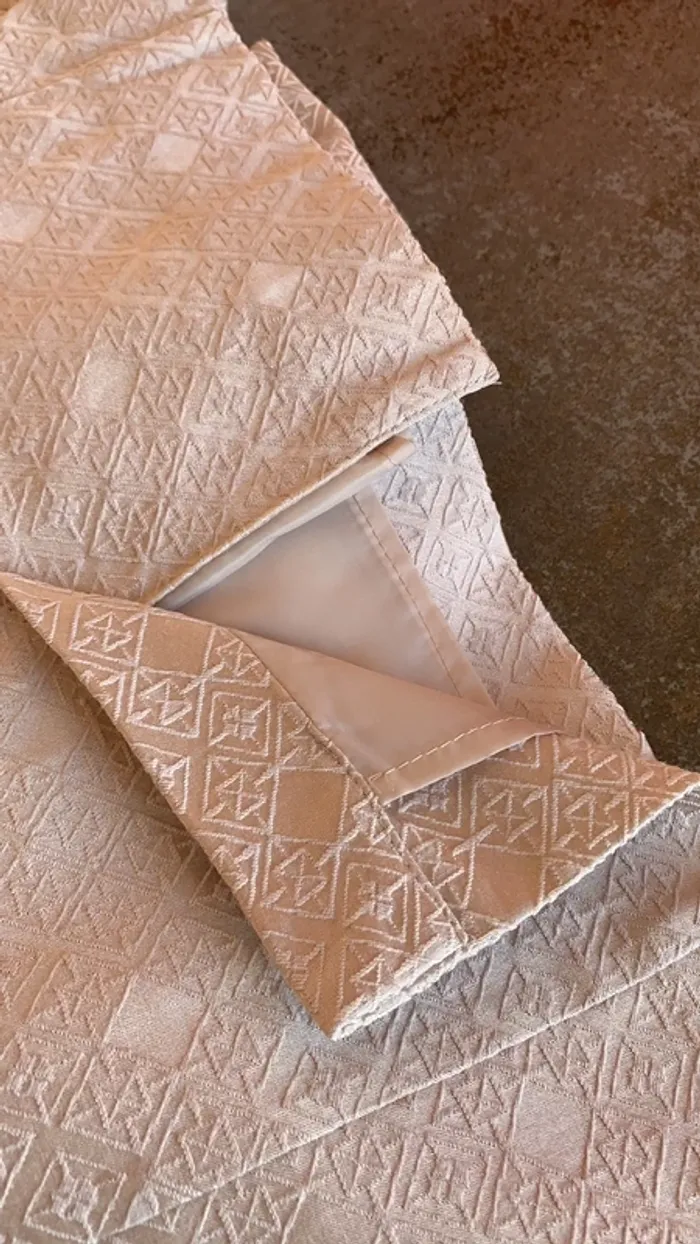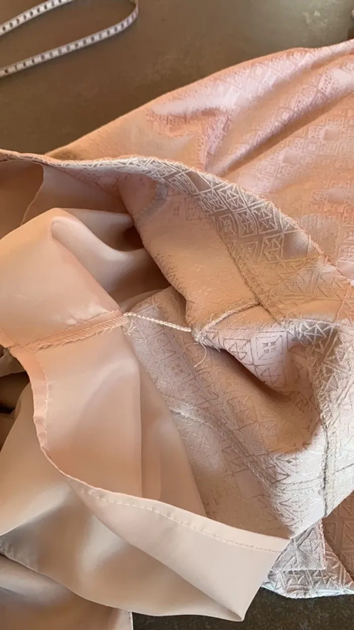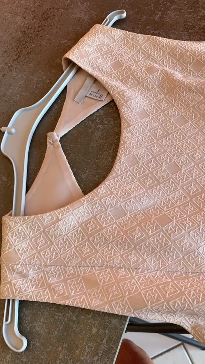 Vend une robe H&M chic entièrement doublée ( elle est reliée à la robe avec un fil de la même couleur et matière que la robe , voir photo ..) . Très belle découpe au dos . Fermée avec une fermeture éclair . Petite ouverture en bas de la robe derrière ( dernière photo) . C’est une taille 42 . Longueur de la robe : 78 cm . Elle est un peu beige , et satinée d’où ses beaux reflets 👍.